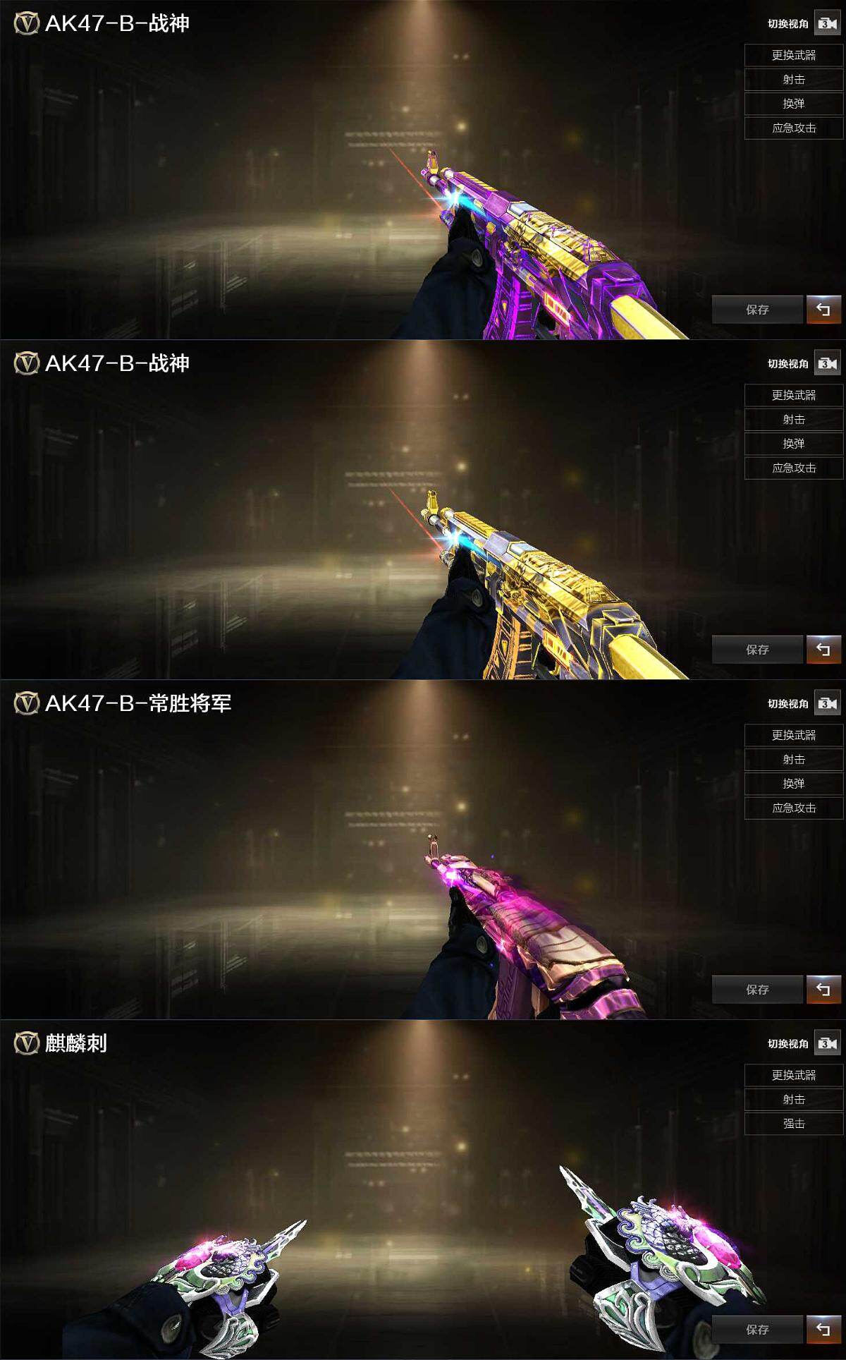 【英雄级武器】:AK47-火麒麟,M4A1-雷神,无影-神兵利器,QBZ03-金色蔷薇,AK47-B-战神,AK47-B-常胜将军,白虎-电玩蓝兔,HK417-朱雀-电竞之星,Barrett-金色蔷薇,Barrett-暗月传说,沙鹰-修罗,天神-动感闪耀,麒麟刺,屠龙-电竞之星,手雷-动感闪耀