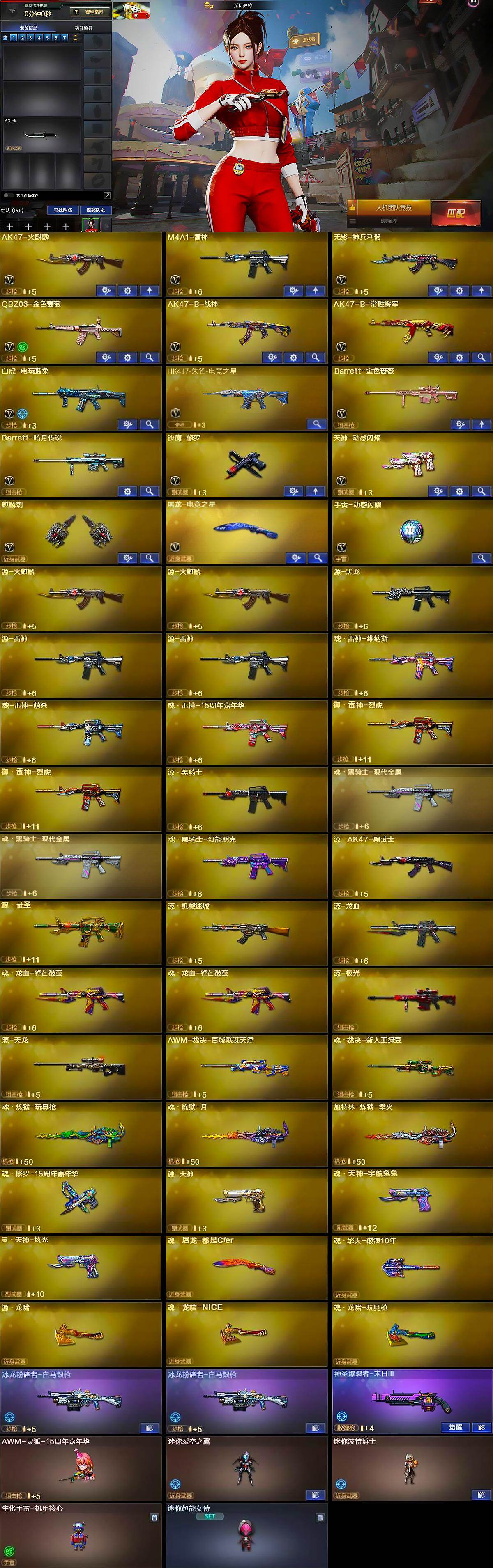 【其他武器】:源·火麒麟*2,源-黑龙,源·雷神*2,魂·雷神-维纳斯,魂-雷神-萌杀,魂·雷神-15周年嘉年华,御·雷神-烈虎*2,源·黑骑士,魂·黑骑士-现代金属*2,魂·黑骑士-幻能朋克,御·黑骑士-冰魄,源·AK47-黑武士,源·天启,源·武圣,源·机械迷城,源-龙血,魂·龙血-锋芒破茧*2,源-极光,源·天龙,AWM-裁决-百城联赛天津,魂·裁决-新人王绿豆,魂·裁决-羽掣,源·毁灭,魂·毁灭-青帝,魂·炼狱-玩具枪,魂·炼狱-月,加特林-炼狱-掌火,魂·修罗-15周年嘉年华,源·天神,魂·天神-宇航兔兔,灵·天神-炫光,魂·屠龙-都是Cfer,魂·擎天-破浪10年,源·龙啸,魂·龙啸-NICE,魂·龙啸-玩具枪