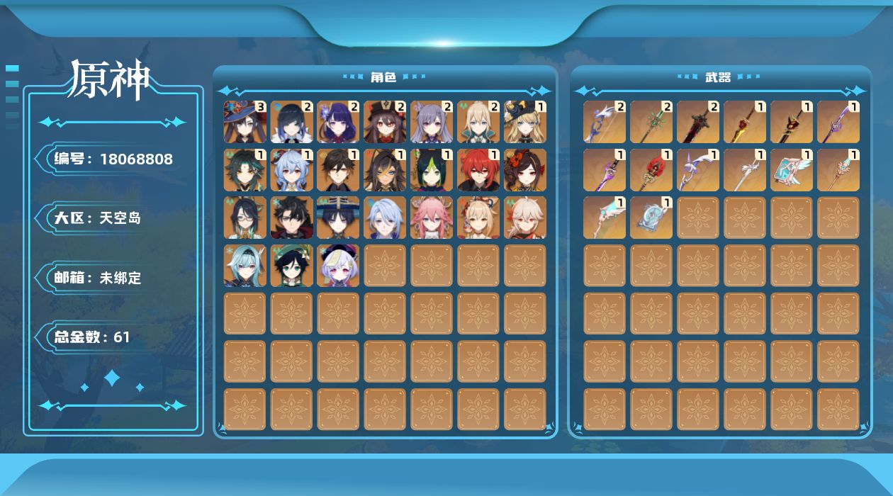0命千织,0命闲云,1命娜维娅,0命莱欧斯利,1命迪希雅,0命流浪者,1命提纳里,2命夜兰,0命神里绫人,0命八重神子,0命优菈,2命雷电将军,0命枫原万叶,1命钟离,2命胡桃,1命甘雨,1命魈,0命宵宫,0命温迪,2命刻晴,0命七七,2命琴,3命莫娜,1命迪卢克,精1有乐御簾切,精2若水,精1赤角石溃杵,精1薙草之稻光,精1雾切之回光,精1护摩之杖,精1四风原典,精2和璞鸢,精1天空之脊,精1天空之翼,精1阿莫斯之弓,精1天空之卷,精1风鹰剑,精2狼的末路