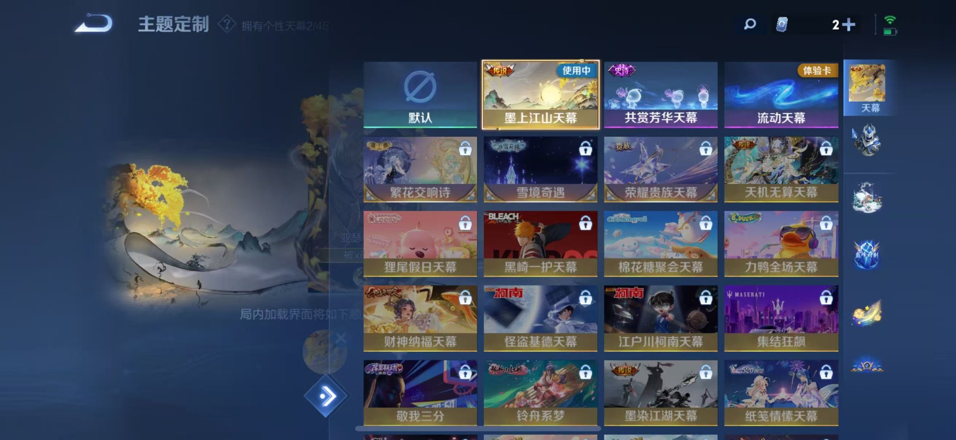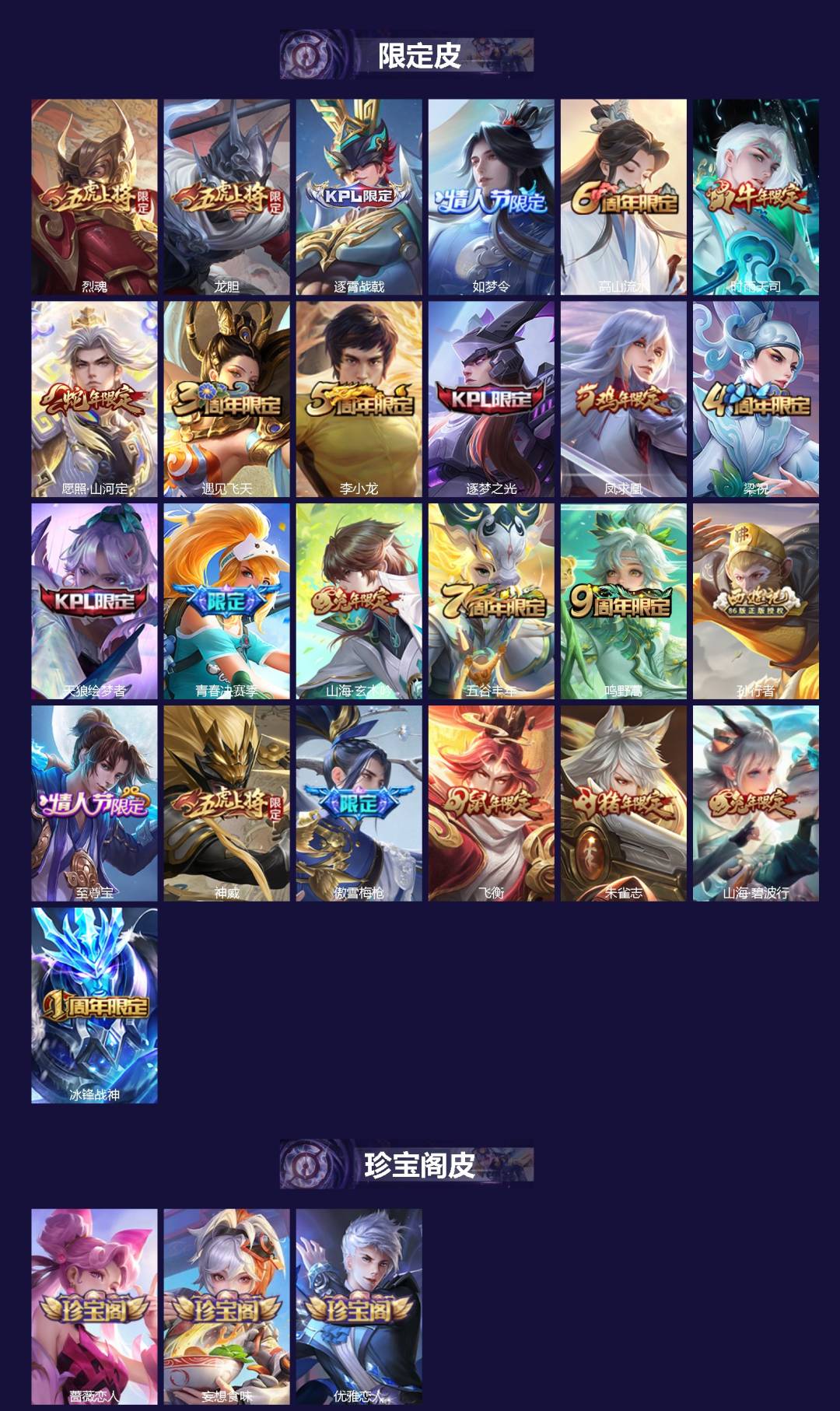 【史诗皮】星界战将,茶境仙,东方月初,乘龙·忆丹青(大乔年限),乘龙·聚宝船(安琪拉年限),蔬乡物语(鲁班七号),器灵·浮梦炉,石田雨龙,紫霞仙子,苍穹之光,白龙吟,黄金分割率,特工魅影,千年之狐,蒙恬荣光圣徽,无限星赏官,冰冠公主,偶像歌手,晚萤,龙骑士(小龙虾),魅语,电玩·爆裂旋风,末日机甲-吕布,猫狗日记-孙策,猫狗日记-大乔,乱世虎臣,节奏热浪,修罗,女仆咖啡,摇滚巨星,水果甜心,绅士熊喵,天才门将,星夜王子,时之奇旅-安琪拉,功夫厨神,德古拉伯爵,暗隐猎兽