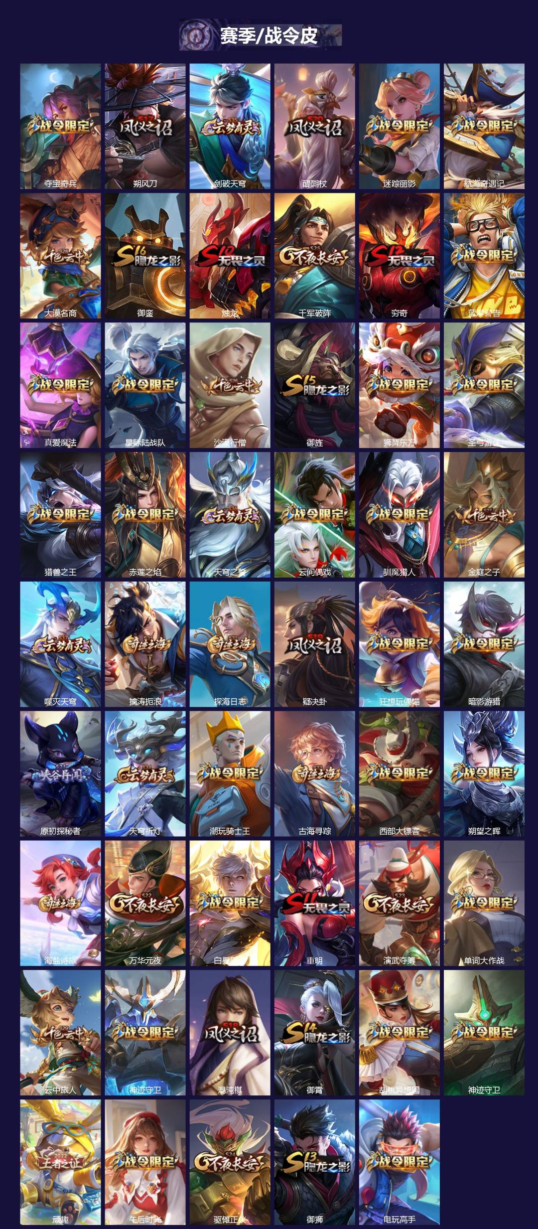【赛季/战令皮】噬灭天穹(s37),古海寻踪(s33),海盐诗旅(s30),擒涛扼浪(s31),探海日志(s32),顽趣-梦奇,剑破天穹(s35),天穹祈灯(s34),天穹之誓(s36),烛龙(s10),重明(s11),穷奇(s12),御狮(s13),御霄(s14),御旌(s15),御銮(s16),朔风刀(s17),混沌棋(s18),疑决卦(s19),醍醐杖(s20),原初探秘者(s21),万华元夜(s22),演武夺筹(s23),驱傩正仪(s24),千军破阵(s25),猎兽之王,白昼王子,朔望之晖,蓝屏警告,神迹守卫-钟馗,狮舞东方,赤莲之焰,驯魔猎人,夺宝奇兵,迷踪丽影,西部大镖客-猪八戒,暗影游猎(游乐娃子),单词大作战,狂想玩偶喵,潮玩骑士王,云间偶戏,星际陆战队-达摩,胡桃异想国,神迹守卫-墨子,航海奇遇记,圣弓游侠,真爱魔法,沙漠行僧(s26),金庭之子(s27),电玩高手(电玩铁子),午后时光,大漠名商(s28),云中旅人(s29)
