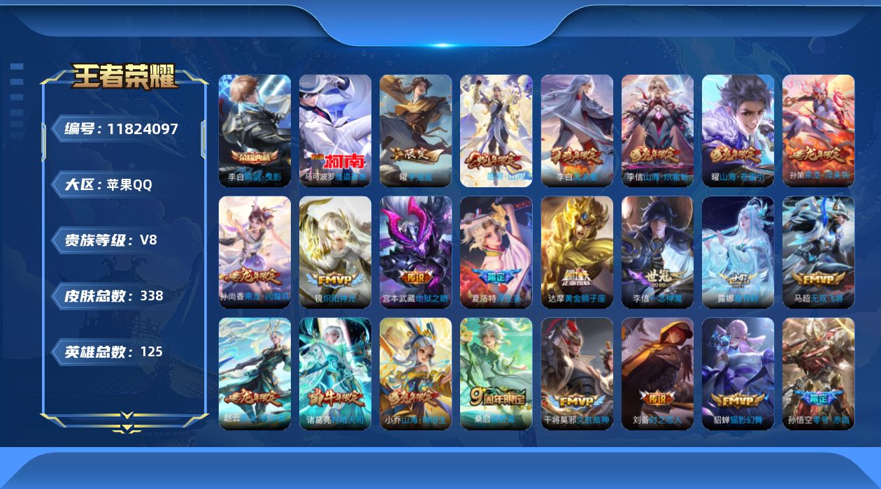 [11824097]V8 1典藏 1珍品传说 26传说 125英雄 338皮肤 可修改实名 男号 【稀有英雄】敖隐(小龙人),大司命,嬴政(始皇帝),韩信(韩跳跳),夏洛特(夏师傅),艾琳,橘右京(橘子),娜可露露(鸟人),不知火舞,赵云,金蝉(唐僧),戈娅 【荣耀水晶】鸣剑·曳影 【珍品传说】怪盗基德 【传说皮】乘龙·淬吴钩(孙策年限),乘龙·铭钟鼎(赵云年限),乘龙·问璇玑(孙尚香年限),李逍遥,山海·炽霜斩(李信年限),山海·琳琅生(小乔年限),黄金狮子座,零号·赤焰,地狱火,地狱之眼,一念神魔,久胜战神,猫影幻舞,炽阳神光,无双飞将,胖达荣荣,时之恋人-刘备(电焊工),超时空战士-狄仁杰,山海·苍雷引(电光曜子),浮生妄,霜月吟 【珍宝阁皮】妄想食味,优雅恋人,蔷薇恋人 【赛季/战令皮】噬灭天穹(s37),古海寻踪(s33),海盐诗旅(s30),擒涛扼浪(s31),探海日志(s32),顽趣-梦奇,剑破天穹(s35),天穹祈灯(s34),天穹之誓(s36),烛龙(s10),重明(s11),穷奇(s12),御狮(s13),御霄(s14),御旌(s15),御銮(s16),朔风刀(s17),混沌棋(s18),疑决卦(s19),醍醐杖(s20),原初探秘者(s21),万华元夜(s22),演武夺筹(s23),驱傩正仪(s24),千军破阵(s25),猎兽之王,白昼王子,朔望之晖,蓝屏警告,神迹守卫-钟馗,狮舞东方,赤莲之焰,驯魔猎人,夺宝奇兵,迷踪丽影,西部大镖客-猪八戒,暗影游猎(游乐娃子),单词大作战,狂想玩偶喵,潮玩骑士王,云间偶戏,星际陆战队-达摩,胡桃异想国,神迹守卫-墨子,航海奇遇记,圣弓游侠,真爱魔法,沙漠行僧(s26),金庭之子(s27),电玩高手(电玩铁子),午后时光,大漠名商(s28),云中旅人(s29) 【史诗皮】星界战将,茶境仙,东方月初,乘龙·忆丹青(大乔年限),乘龙·聚宝船(安琪拉年限),蔬乡物语(鲁班七号),器灵·浮梦炉,石田雨龙,紫霞仙子,苍穹之光,白龙吟,黄金分割率,特工魅影,千年之狐,蒙恬荣光圣徽,无限星赏官,冰冠公主,偶像歌手,晚萤,龙骑士(小龙虾),魅语,电玩·爆裂旋风,末日机甲-吕布,猫狗日记-孙策,猫狗日记-大乔,乱世虎臣,节奏热浪,修罗,女仆咖啡,摇滚巨星,水果甜心,绅士熊喵,天才门将,星夜王子,时之奇旅-安琪拉,功夫厨神,德古拉伯爵,暗隐猎兽