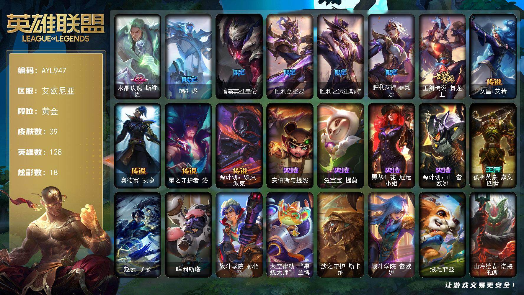 [18070988]【特价出售/店主推荐】 黄金段位-128英雄-39皮肤-18炫彩-0终极-0神话-8限定-4传说-4史诗 【热门头像】:春晖神女头像 【臻彩皮肤】:战斗学院盖伦不死鸟 【情人节限定】:水晶玫瑰斯维因 【限定皮肤】:DWG烬,暗裔英雄盖伦,胜利剑圣易,胜利之运崔斯特,胜利女神菲奥娜,玉剑传说舞龙卫 【传说皮肤】:女皇艾希,奥德赛凯隐,星之守护者洛,源计划毁灭派克 【史诗皮肤】:安伯斯与提妮,兔宝宝提莫,黑帮狂花厄运小姐,源计划山蕾欧娜 【王者皮肤】:孤胆英豪嘉文四世 【其他皮肤】:赵云子龙,哞利斯塔,战斗学院孙悟空,太空律动串烧大师兰博,沙之守护斯卡纳,战斗学院蕾欧娜,绒毛菲兹,山海绘卷诺提勒斯,禁魔石巨像诺提勒斯,胜利女神菲奥娜,少校吉格斯,创世之神赫卡里姆,人马星神赫卡里姆,屠龙勇士黛安娜,神龙尊者玉境灵龙卡莎,星之守护者萨勒芬妮,狂狮纳尔,双城之战金克丝,幻灵战斗猫金克丝,福牛守护者佛耶戈,五杀摇滚之噪音佛耶戈,夺命前锋卢锡安,德玛西亚警官卢锡安