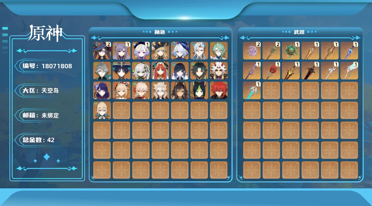 0命娜维娅,0命芙宁娜,0命那维莱特,0命白术,0命迪希雅,0命艾尔海森,0命流浪者,0命纳西妲,0命妮露,0命提纳里,0命夜兰,0命荒泷一斗,0命雷电将军,0命枫原万叶,0命魈,0命宵宫,0命阿贝多,1命刻晴,1命七七,0命琴,2命莫娜,0命迪卢克,精1碧落之珑,精1苇海信标,精1赤沙之杖,精1圣显之钥,精1波乱月白经津,精2不灭月华,精1薙草之稻光,精1护摩之杖,精2和璞鸢,精1天空之翼,精1天空之刃,精1风鹰剑,精1狼的末路