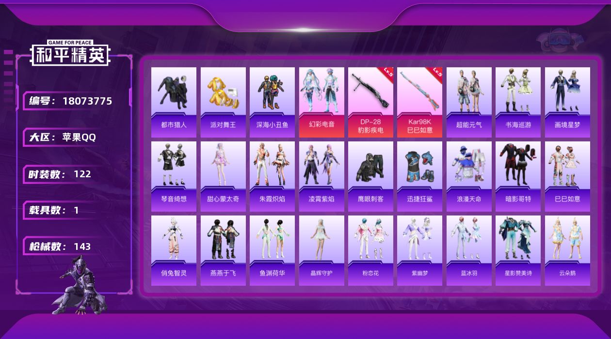 [18073775]【特价出售/店主推荐】苹果 手Q-1粉装-7特效枪-1载具-5粉色飞行器-40314热力值-7王牌印记-122套装-143枪皮