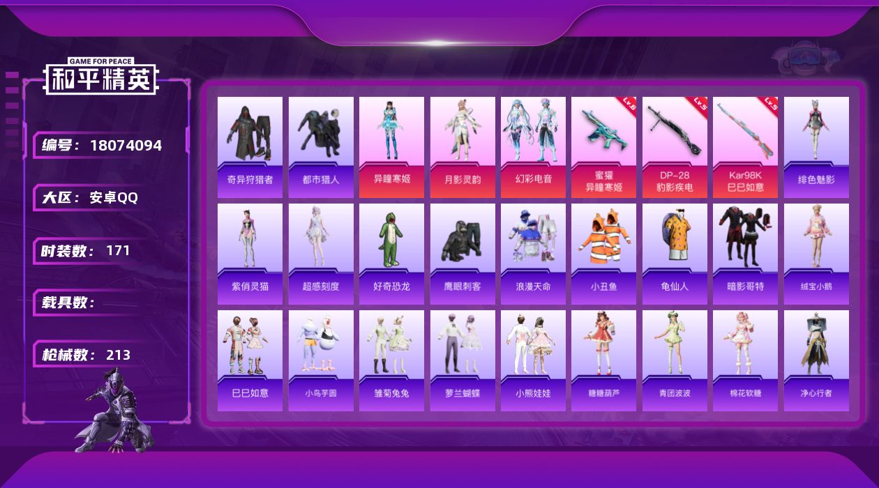 [18074094]安卓 手Q-3粉装-6特效枪-0载具-1粉色飞行器-61209热力值-10王牌印记-171套装-213枪皮 【热门品类】:套装-浪漫天命,套装-都市猎人,套装-小丑鱼,套装-奇异狩猎者,套装-龟仙人,套装-暗影哥特 【粉色套装】:角色-月影灵韵,粉装-幻彩电音,角色-异瞳寒姬 【粉色枪皮等级】:蜜獾-异瞳寒姬(六级),ACE32-萌骑漫游(三级),AKS-74U-森灵之息(五级),Kar98K-巳巳如意(五级),Mk14-福马献瑞(五级),DP-28-豹影疾电(五级) 【粉色枪皮】:蜜獾-异瞳寒姬,ACE32-萌骑漫游,AKS-74U-森灵之息,Kar98K-巳巳如意,Mk14-福马献瑞,DP-28-豹影疾电 【粉色飞行器】:炫彩糖果飞行器 【粉色降落伞】:绝对恒星降落伞,恐龙拽拽降落伞,炫光之旅降落伞,拳皇·狂花道降落伞,千金淑猫降落伞,月影灵韵降落伞,圣辉之星降落伞,圣斗士星矢降落伞,星穹咏叹调降落伞,冷漠罗丽降落伞,无垠阁降落伞,异瞳寒姬降落伞,炫彩糖果降落伞 【稀有套装】:套装-龟仙人,套装-绒宝小鹅,套装-巳巳如意,套装-小鸟芋圆,角色-超感刻度,套装-雪国风尚,套装-炫彩糖果,套装-马上有钱,套装-雏菊兔兔,套装-萝兰蝴蝶,套装-小熊娃娃,套装-糖糖葫芦,套装-青团波波,套装-棉花软糖,套装-净心行者,角色-许七安,套装-燕燕于飞,套装-鱼渊荷华,角色-蜜桃派对,角色-冰晶湖光,套装-樱梦幻音,套装-烈焰独狼,套装-粉恋花,套装-紫幽梦,套装-蓝冰羽,套装-星渊小夜曲,套装-霓虹热舞,套装-彩虹兔,套装-云朵鹅,套装-雪绒豹,角色-时希公主,角色-绯色魅影,角色-紫俏灵猫,角色-月烬之祷,套装-雨过天青,套装-红釉青花 【稀有枪皮】:AUG-冰晶雪宝,AKM-彩虹符号,AKM-影袭,AKM-破晓战魂,AKM-缤纷海域,AKM-龙的传人,M16A4-幻世战舞者,M16A4-红色方程式,M16A4-蓝色火焰,SCAR-L-夜灯,SCAR-L-玉兔迎春,SCAR-L-红色方程式,M416-糯团青竹,M416-红色方程式,M416-蓝色火焰,M416-黄金龙骨,GROZA-影袭,GROZA-荧海星豚,AUG-天降萌叽,AUG-耀粉歌者,AUG-月影灵韵,AUG-绝对恒星,QBZ-彩虹符号,M762-彩虹符号,M762-云朵鹅,M762-登顶巅峰,AC-VAL-