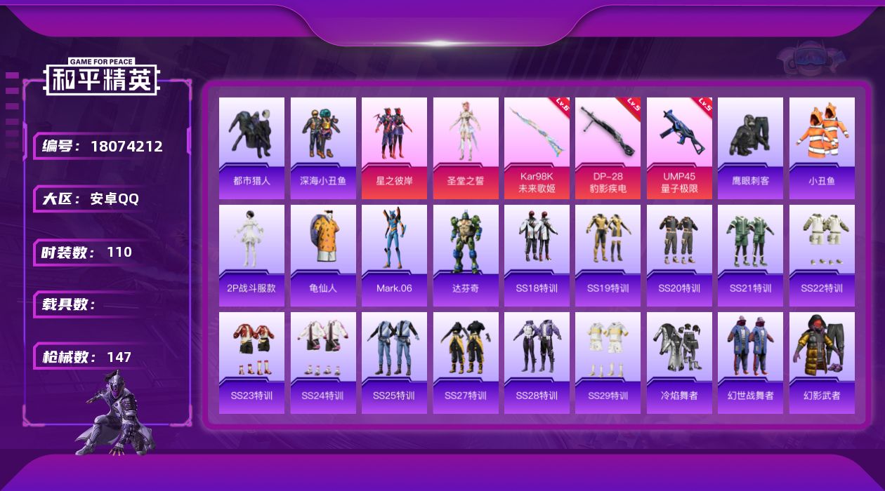 [18074212]【特价出售/店主推荐】安卓 手Q-2粉装-6特效枪-1粉色飞行器-45604热力值-5王牌印记-110套装-147枪皮【热门品类】:套装-都市猎人,套装-深海小丑鱼,套装-小丑鱼,角色-2P战斗服款,套装-龟仙人,角色-Mark.06【粉色套装】:粉装-星之彼岸,角色-圣堂之誓【粉色枪皮等级】:ACE32-萌骑漫游(二级),UMP45-量子极限(五级),AKS-74U-森灵之息(四级),Kar98K-未来歌姬(六级),Mk14-福马献瑞(五级),DP-28-豹影疾电(五级)【粉色枪皮】:ACE32-萌骑漫游,UMP45-量子极限,AKS-74U-森灵之息,Kar98K-未来歌姬,Mk14-福马献瑞,DP-28-豹影疾电【粉色飞行器】:变形金刚飞行器