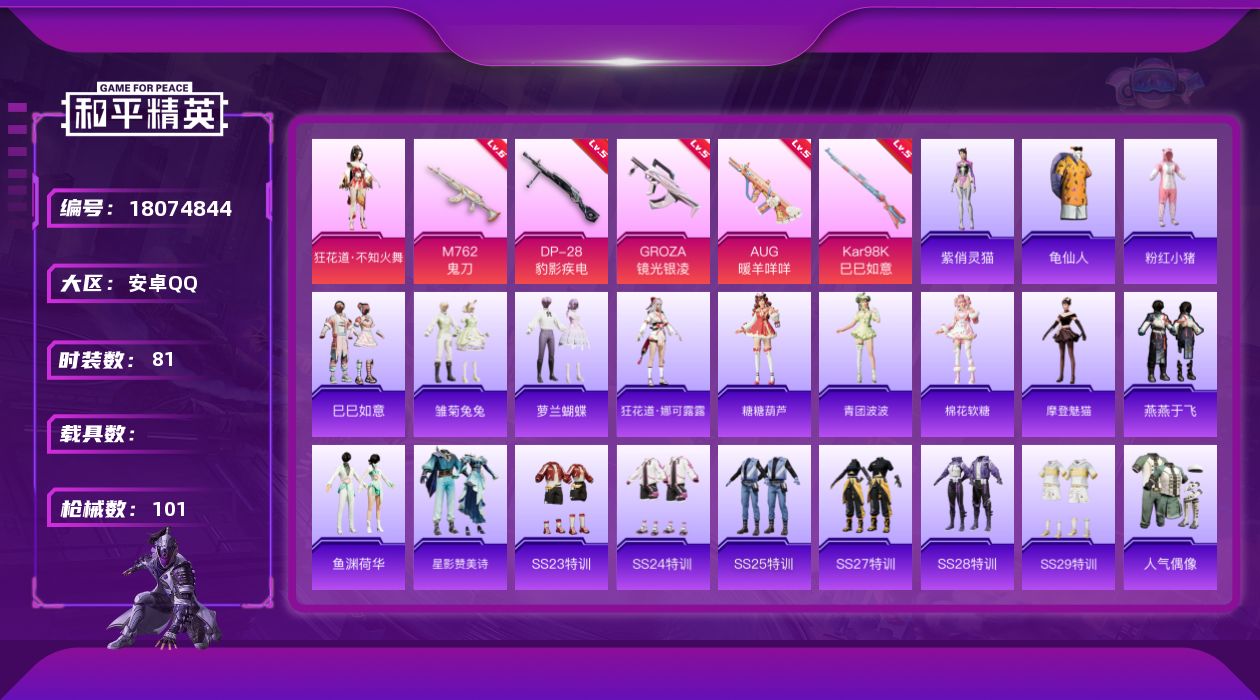 - [15219562]【店主推荐捡漏号!可直接换绑】/素材身法号 安卓 手Q-14粉装-12特效枪-3载具-5粉色飞行器-8.9w热力值-19王牌印记-197套装-252枪皮【热门品类】:粉装-梦幻火箭,套装-浪漫天命,套装-赤蝎幽灵,套装-都市猎人,套装-派对舞王,套装-奇异狩猎者,套装-金羽特工,套装-暗夜行者,套装-龟仙人,套装-暗影哥特,角色-8号机,角色-Mark.06【粉色载具】:玛莎拉蒂Quattroporte(夜幕蓝),迈凯伦570S(天际蓝),合金龙骨(蓝)【粉色套装】:粉装-极限特训,粉装-幻影战神,粉装-未来战士,粉装-梦幻火箭,粉装-放客神游,粉装-新星烈龙,粉装-冰霜白皇,粉装-炙焰红王,粉装-暗星紫秘,粉装-星夜魔法师,粉装-冰川幽秘,粉装-黄族统领,粉装-炫光之旅,角色-白兰星【粉色枪皮等级】:AKM-梦之光华(七级),AKM-星际浪客(一级),SCAR-L-童趣迷兔(七级),M416-五爪金龙(二级),M416-风花雪月(七级),M762-激战未来(五级),UMP45-启明星(五级),Vector-环太平洋(五级),Kar98K-巳巳如意(五级),DP-28-圣堂之誓(五级),DP-28-豹影疾电(五级),MG-36-沧焰双生(五级)【粉色飞行器】:梦幻火箭飞行器,甜梦小狐飞行器,星夜魔法师飞行翼,全功率超战飞行器,黄族统领飞行器