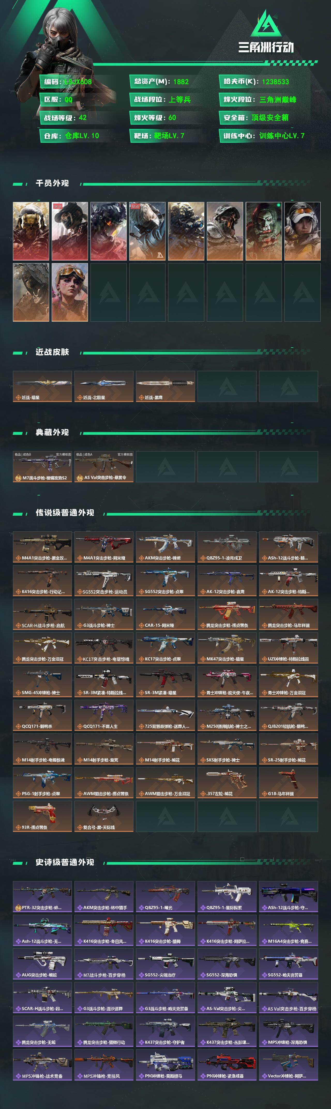 [18075433]【特价出售/店主推荐】1882m总资产-1238533k哈夫币-60烽火等级-三角洲巅峰-42战场等级-上等兵 【干员外观】:红狼-蚀金玫瑰,露娜-黑·天际线,威龙-凌霄戍卫,蜂医-送葬人·无题密令,无名-夜鹰,深蓝-不破誓约,红狼-电锯惊魂,露娜-金牌射手,乌鲁鲁-荒原猎手,蛊-不羁人生 【近战皮肤】:近战-暗星,近战-北极星,近战-黑鹰 【典藏外观】:M7战斗步枪-棱镜攻势S2,AS Val突击步枪-悬赏令 【典藏外观成色】:M7战斗步枪-棱镜攻势S2(极品B),AS Val突击步枪-悬赏令(极品A) 【传说外观】:M4A1突击步枪-蚀金玫瑰,M4A1突击步枪-阿米娅,AKM突击步枪-锦绣,QBZ95-1突击步枪-凌霄戍卫,ASh-12战斗步枪-鹅鸭杀,K416突击步枪-行动记录,SG552突击步枪-运动员,SG552突击步枪-点翠,AK-12突击步枪-夜鹰,AK-12突击步枪-特斯拉线圈,SCAR-H战斗步枪-启航,G3战斗步枪-骑士,CAR-15突击步枪-阿米娅,腾龙突击步枪-捞点薯条,腾龙突击步枪-马年祥瑞,腾龙突击步枪-万金泪冠,KC17突击步枪-电锯惊魂,KC17突击步枪-点翠,MK47突击步枪-暗星,UZI冲锋枪-特斯拉线圈,SMG-45冲锋枪-骑士,SR-3M紧凑突击步枪-特斯拉线圈,SR-3M紧凑突击步枪-暗星,勇士冲锋枪-能天使-午夜邮差,勇士冲锋枪-万金泪冠,QCQ171冲锋枪-鹅鸭杀,QCQ171冲锋枪-不羁人生,725双管霰弹枪-送葬人-无题密令,M250通用机枪-骑士之心,QJB201轻机枪-鹅鸭杀,M14射手步枪-电锯惊魂,M14射手步枪-蛮荒,M14射手步枪-缄花,SKS射手步枪-骑士,SR-25射手步枪-缄花,PSG-1射手步枪-点翠,AWM狙击步枪-捞点薯条,AWM狙击步枪-万金泪冠,.357左轮-缄花,G18-马年祥瑞,93R-捞点薯条,复合弓-黑·天际线 【史诗外观】:PTR-32突击步枪-碎冰行动,AKM突击步枪-林中猎手,QBZ95-1突击步枪-曙光,QBZ95-1突击步枪-星际探索,ASh-12战斗步枪-守夜人,ASh-12战斗步枪-无极限,K416突击步枪-冬日风情,K416突击步枪-腊梅,K416突击步枪-阿萨拉特攻,M16A4突击步枪-竞赛选手,AUG突击步枪-蝮蛇,M7战斗步枪-百步穿杨,SG552突击步枪-