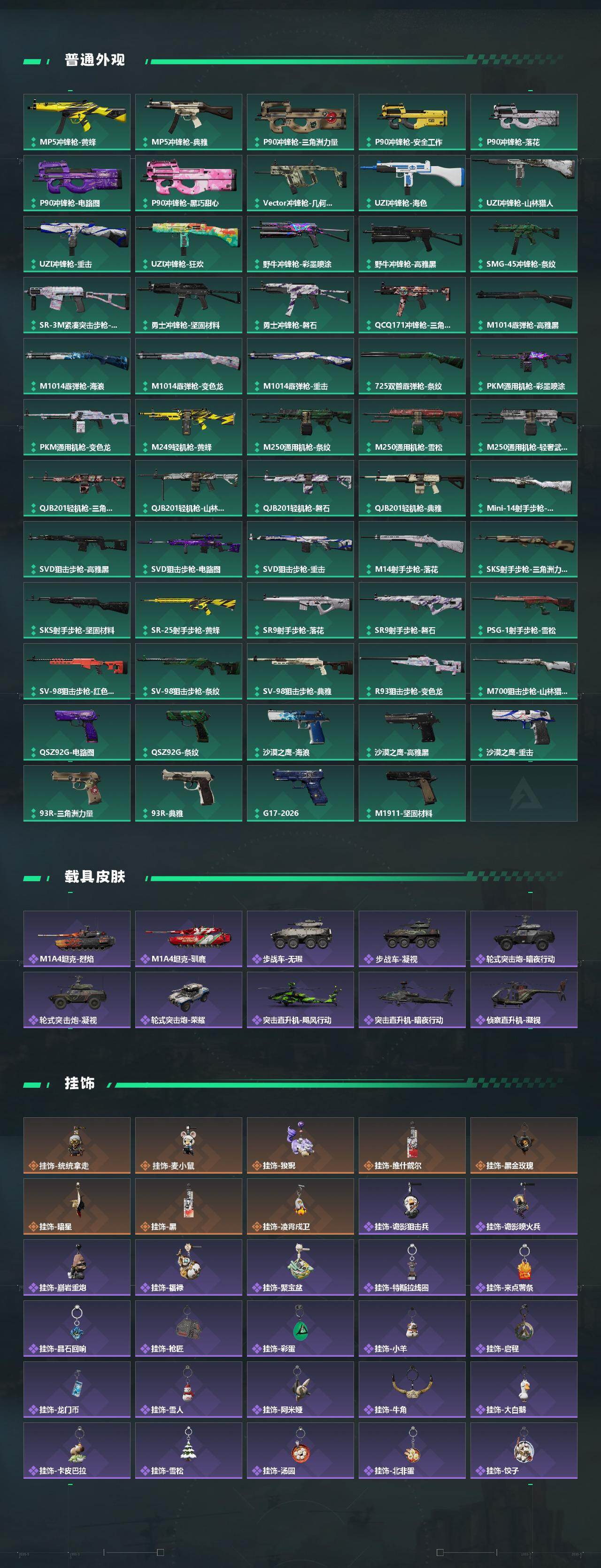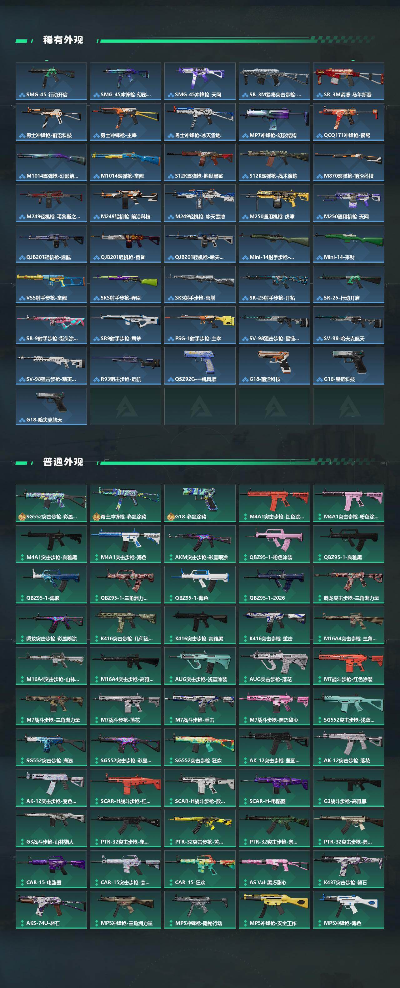 【传说外观】:M4A1突击步枪-蚀金玫瑰,M4A1突击步枪-阿米娅,AKM突击步枪-锦绣,QBZ95-1突击步枪-凌霄戍卫,ASh-12战斗步枪-鹅鸭杀,K416突击步枪-行动记录,SG552突击步枪-运动员,SG552突击步枪-点翠,AK-12突击步枪-夜鹰,AK-12突击步枪-特斯拉线圈,SCAR-H战斗步枪-启航,G3战斗步枪-骑士,CAR-15突击步枪-阿米娅,腾龙突击步枪-捞点薯条,腾龙突击步枪-马年祥瑞,腾龙突击步枪-万金泪冠,KC17突击步枪-电锯惊魂,KC17突击步枪-点翠,MK47突击步枪-暗星,UZI冲锋枪-特斯拉线圈,SMG-45冲锋枪-骑士,SR-3M紧凑突击步枪-特斯拉线圈,SR-3M紧凑突击步枪-暗星,勇士冲锋枪-能天使-午夜邮差,勇士冲锋枪-万金泪冠,QCQ171冲锋枪-鹅鸭杀,QCQ171冲锋枪-不羁人生,725双管霰弹枪-送葬人-无题密令,M250通用机枪-骑士之心,QJB201轻机枪-鹅鸭杀,M14射手步枪-电锯惊魂,M14射手步枪-蛮荒,M14射手步枪-缄花,SKS射手步枪-骑士,SR-25射手步枪-缄花,PSG-1射手步枪-点翠,AWM狙击步枪-捞点薯条,AWM狙击步枪-万金泪冠,.357左轮-缄花,G18-马年祥瑞,93R-捞点薯条,复合弓-黑·天际线