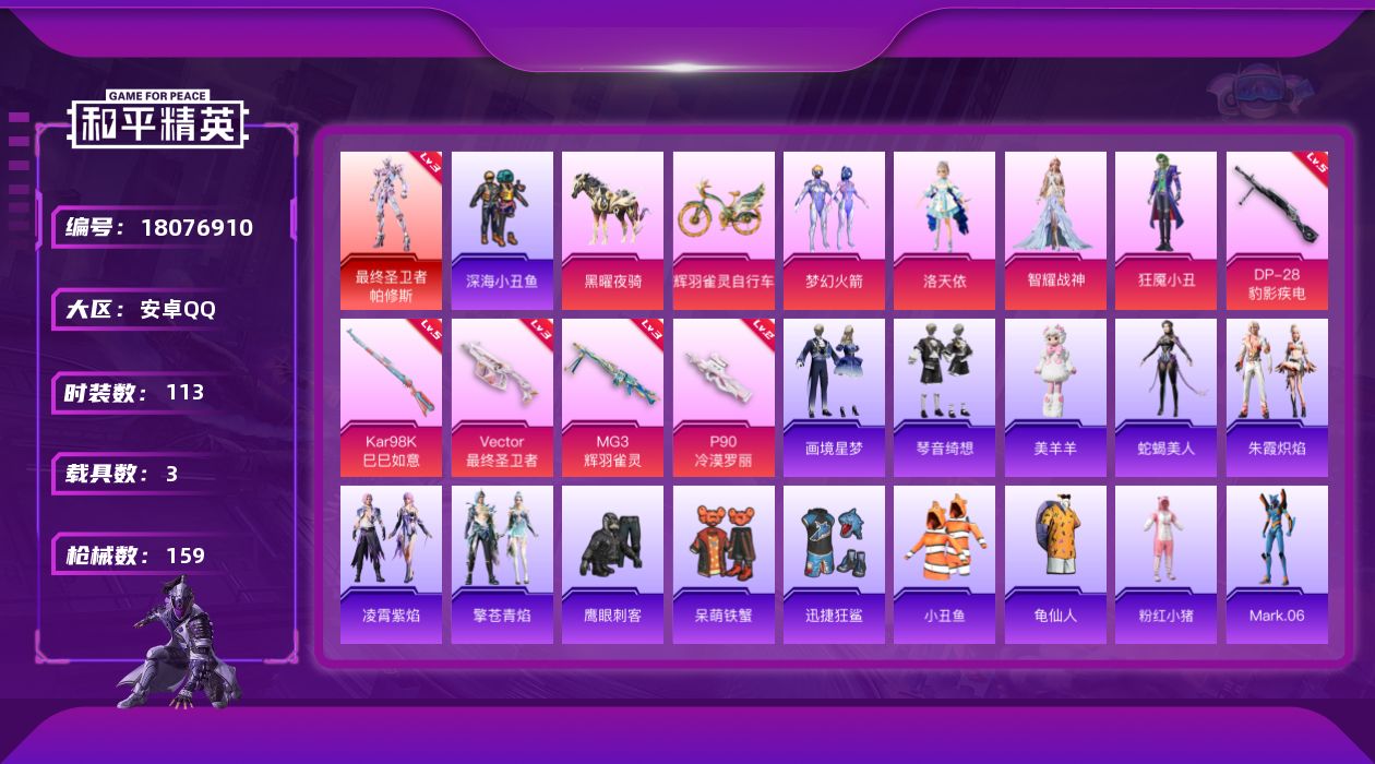[18076910]安卓 手Q-1神装-4粉装-7特效枪-3载具-6粉色飞行器-51306热力值-12王牌印记-113套装-159枪皮 【红色神装等级】:最终圣卫者-帕修斯(三级) 【红色角色神装】:最终圣卫者-帕修斯 【热门品类】:粉装-梦幻火箭,套装-深海小丑鱼,套装-小丑鱼,套装-龟仙人,套装-粉红小猪,角色-Mark.06 【粉色套装】:粉装-梦幻火箭,角色-洛天依,角色-智耀战神,角色-狂魇小丑 【粉色枪皮等级】:UMP45-萌骑冒险(二级),Vector-最终圣卫者(三级),P90-冷漠罗丽(二级),Kar98K-巳巳如意(五级),Mk14-福马献瑞(五级),DP-28-豹影疾电(五级),MG3-辉羽雀灵(三级) 【粉色载具】:黑曜夜骑,九霄玄鹿,辉羽雀灵自行车 【粉色枪皮】:UMP45-萌骑冒险,Vector-最终圣卫者,P90-冷漠罗丽,Kar98K-巳巳如意,Mk14-福马献瑞,DP-28-豹影疾电,MG3-辉羽雀灵 【粉色飞行器】:深渊漩涡飞行器,雀灵庇佑飞行器,时光之誓飞行器,终晖之翼飞行器,灵猫魔法师飞行器,云梦轻舟飞行器 【粉色降落伞】:第五大道降落伞,镜域双华降落伞,创世·救赎降落伞,宇宙意志降落伞,月影灵韵降落伞,辉羽雀灵降落伞,幻彩电音降落伞,时光之吻降落伞,最终圣卫者降落伞,冷漠罗丽降落伞,荧海星豚降落伞,镜花水月降落伞 【稀有套装】:套装-龟仙人,套装-巳巳如意,套装-小鸟芋圆,套装-雪国风尚,套装-马上来财,角色-俏兔智灵,套装-镭金极速,套装-闪电轻猫,角色-猎影月神,套装-云朵鹅,套装-雪绒豹,套装-诡诞巡游,套装-混沌火种,套装-朱霞炽焰,套装-凌霄紫焰,套装-擎苍青焰,角色-蛇蝎美人,玩偶服-美羊羊,套装-画境星梦,套装-琴音绮想,套装-雨过天青,套装-红釉青花 【稀有枪皮】:AKM-彩虹符号,AKM-影袭,AKM-春暖花开,AKM-生命誓言,AKM-破晓战魂,AKM-缤纷海域,AKM-虎虎生威,AKM-龙的传人,M16A4-幻世战舞者,M16A4-最终圣卫者,SCAR-L-玉兔迎春,SCAR-L-红色方程式,GROZA-影袭,AUG-耀粉歌者,QBZ-彩虹符号,QBZ-洛神天依,M762-彩虹符号,M762-云朵鹅,Mk47-洛神天依,G36C-蛇蝎美人,AC-VAL-天降萌叽,蜜獾-天降萌叽,蜜獾-绯穹魔姬,ACE32-画境星梦,AR