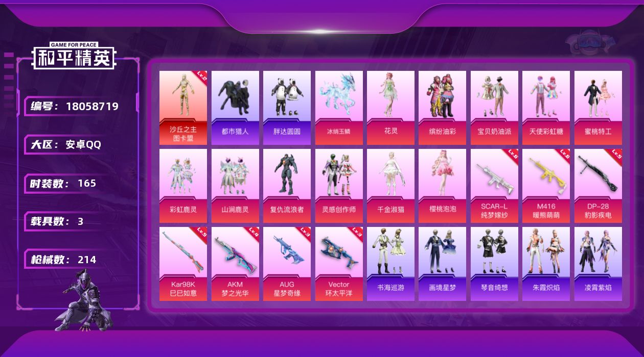 [18058719]安卓 手Q-1神装-13粉装-11特效枪-3载具-8粉色飞行器-73522热力值-11王牌印记-165套装-214枪皮
