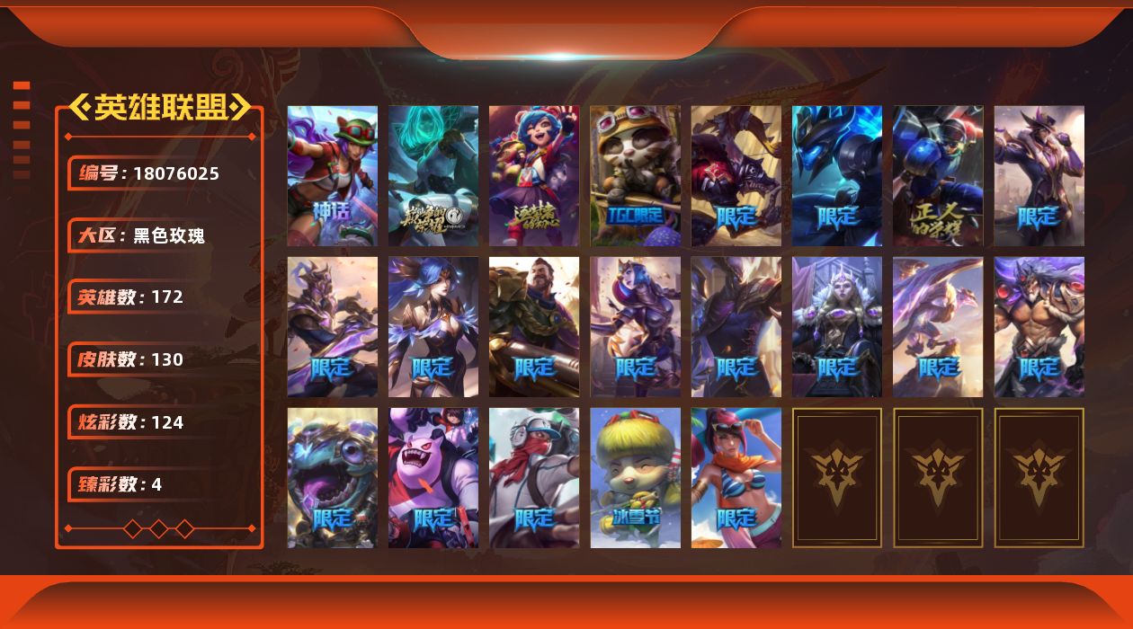 [18076025]未定级段位-172英雄-130皮肤-124炫彩-0终极-3神话-20限定-7传说-28史诗