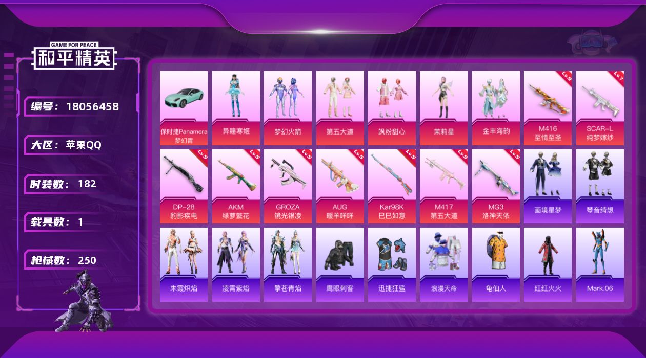 [18056458]苹果 手Q-6粉装-12特效枪-1载具-3粉色飞行器-73440热力值-16王牌印记-182套装-250枪皮 【热门品类】:粉装-梦幻火箭,套装-浪漫天命,套装-龟仙人,套装-红红火火,角色-Mark.06 【粉色套装】:粉装-梦幻火箭,粉装-第五大道,粉装-飒粉甜心,角色-茉莉星,粉装-金丰海韵,角色-异瞳寒姬 【粉色枪皮等级】:AKM-绿萝繁花(五级),SCAR-L-纯梦嫁纱(七级),M416-至情至圣(九级),GROZA-镜光银凌(五级),AUG-暖羊咩咩(五级),UMP45-萌骑冒险(五级),AKS-74U-森灵之息(五级),Kar98K-巳巳如意(五级),Mk14-福马献瑞(三级),M417-第五大道(五级),DP-28-豹影疾电(五级),MG3-洛神天依(五级) 【粉色载具】:保时捷Panamera(梦幻青) 【粉色枪皮】:AKM-绿萝繁花,SCAR-L-纯梦嫁纱,M416-至情至圣,GROZA-镜光银凌,AUG-暖羊咩咩,UMP45-萌骑冒险,AKS-74U-森灵之息,Kar98K-巳巳如意,Mk14-福马献瑞,M417-第五大道,DP-28-豹影疾电,MG3-洛神天依 【粉色飞行器】:炫彩糖果飞行器,拂晓神骑飞行器 【粉色降落伞】:绝对恒星降落伞,幻影战神降落伞,梦幻火箭降落伞,洛神天依降落伞,暗星紫秘降落伞,暗夜鎏金降落伞,海螺星光降落伞,第五大道降落伞,仲夏莫吉托降落伞,圣堂之誓降落伞,江南烟雨降落伞,异瞳寒姬降落伞,炫彩糖果降落伞 【稀有套装】:套装-龟仙人,套装-巳巳如意,套装-炫彩糖果,套装-马上来财,套装-糖糖葫芦,套装-青团波波,套装-燕燕于飞,套装-鱼渊荷华,角色-风玲,套装-紫幽梦,套装-蓝冰羽,套装-云朵鹅,套装-雪绒豹,角色-绛羽幽主,套装-朱霞炽焰,套装-凌霄紫焰,套装-擎苍青焰,套装-画境星梦,套装-琴音绮想,套装-雨过天青,套装-红釉青花 【稀有枪皮】:AKM-彩虹符号,AKM-破晓战魂,AKM-胡桃卫兵,AKM-龙的传人,M16A4-幻世战舞者,M16A4-甜心亚梦,M16A4-红色方程式,M16A4-蓝色火焰,SCAR-L-夜灯,SCAR-L-炫彩节奏,SCAR-L-玉兔迎春,SCAR-L-红色方程式,M416-糯团青竹,M416-红色方程式,M416-蓝色火焰,GROZA-2B战斗服款,GROZA-异彩先驱,GRO