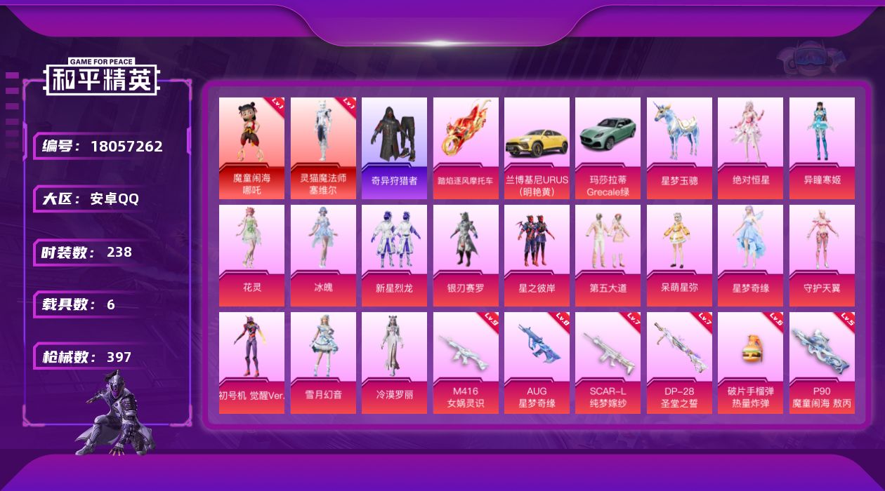 - [17109211]【1741】苹果 微信-无敌战神框-3神装-35粉装-37特效枪-9载具-19粉色飞行器-152935热力值-12王牌印记-247套装-367枪皮 【红色载具】:保时捷911 敞篷版(小暴龙)(二级) 【红色神装等级】:魔童闹海-敖丙(一级),魔童闹海-哪吒(一级),精灵之光-露米娜(二级) 【红色角色神装】:魔童闹海-敖丙,魔童闹海-哪吒,精灵之光-露米娜 【热门品类】:粉装-怪诞乔克,粉装-雪国幻梦,粉装-梦幻火箭,粉装-缤纷油彩,套装-浪漫天命,套装-都市猎人,套装-派对舞王,套装-深海小丑鱼,套装-小丑鱼,套装-奇异狩猎者,角色-军刀雅典娜,套装-胖达团团,套装-忍者信条,套装-AG战队服,套装-龟仙人,套装-暗影哥特,角色-Mark.06,套装-红熊茄茄 【粉色套装】:粉装-极限特训,粉装-幻影战神,粉装-未来战士,粉装-怪诞乔克,粉装-甜心巧克力,粉装-宝贝奶油派,粉装-天使彩虹糖,粉装-雪国幻梦,粉装-梦幻火箭,粉装-智能音符,粉装-缤纷油彩,粉装-放客神游,粉装-彗云及圣,粉装-星之彼岸,角色-洛天依,角色-初号机款机体服,粉装-恐龙拽拽,粉装-甜梦小狐,角色-复仇流浪者,粉装-暖熊萌萌,粉装-冰川幽秘,粉装-冰川红玫,粉装-第五大道,粉装-仲夏莫吉托,粉装-莲影清波,粉装-镜光幻境,粉装-机械师花傲天,角色-千金淑猫,角色-月影灵韵,角色-智耀战神,角色-狂魅哈莉,角色-冷漠罗丽,角色-荧海星豚,角色-奇迹舞步 美琪,角色-异瞳寒姬 【粉色枪皮等级】:AKM-甜心宝贝(四级),AKM-炫紫旋律(一级),AKM-绿萝繁花(五级),SCAR-L-青春物语(五级),SCAR-L-锦绣绵绵(五级),SCAR-L-金蛇镇世(六级),SCAR-L-魔童闹海 哪吒(三级),M416-至情至圣(八级),M416-电玩时刻(五级),M416-墨龙九天(一级),M416-灵猫魔法师(二级),GROZA-精灵之光(一级),GROZA-无垠阁(三级),AUG-星梦奇缘(六级),AUG-暖羊咩咩(五级),蜜獾-异瞳寒姬(二级),ARX-无垠阁(四级),UMP45-恐龙拽拽(三级),Vector-环太平洋(四级),汤姆逊-冰川粉黛(三级),AKS-74U-星穹咏叹调(三级),AKS-74U-无垠阁(三级),P90-沙丘之主(三级),P90-金丰海韵(一级),P90-冷漠罗丽