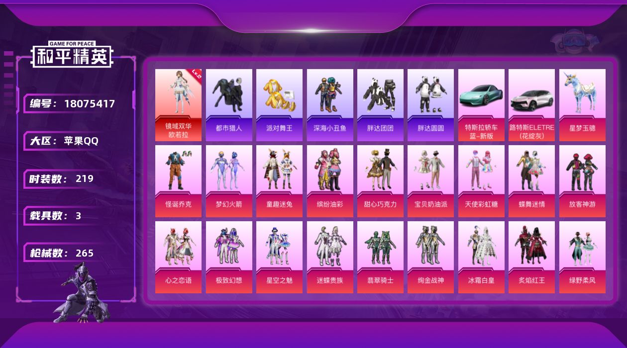 [18075417]可二次【特价出售/店主推荐】苹果 手Q-1神装-30粉装-12特效枪-3载具-9粉色飞行器-109393热力值-15王牌印记-219套装-265枪皮【红色神装等级】:镜域双华-欧若拉(二级)【热门品类】:粉装-怪诞乔克,粉装-梦幻火箭,粉装-童趣迷兔,粉装-缤纷油彩,套装-浪漫天命,套装-都市猎人,套装-派对舞王,套装-深海小丑鱼,套装-小丑鱼,套装-胖达团团,套装-胖达圆圆,套装-龟仙人,套装-潮萌小黄鸭,套装-暗影哥特,套装-浪漫波比,套装-糯粉咩咩,套装-软软马卡龙,角色-8号机,角色-Mark.06,套装-红熊茄茄【粉色套装】:粉装-怪诞乔克,粉装-甜心巧克力,粉装-宝贝奶油派,粉装-天使彩虹糖,粉装-蝶舞迷情,粉装-梦幻火箭,粉装-缤纷油彩,粉装-放客神游,粉装-心之恋语,粉装-极致幻想,粉装-星空之魅,粉装-迷蝶贵族,粉装-翡翠骑士,粉装-绚金战神,粉装-冰霜白皇,粉装-童趣迷兔,粉装-炙焰红王,粉装-绿野柔风,粉装-葫芦兄弟,粉装-甜梦小狐,粉装-暖熊萌萌,粉装-仲夏莫吉托,粉装-傲傲奶龙,角色-小叽联名款,角色-小蓝,角色-美雪,角色-电磁星,角色-初号机 觉醒Ver.,角色-狂花道·不知火舞,角色-千金淑猫【粉色枪皮等级】:AKM-梦之光华(七级),SCAR-L-梦幻火箭(七级),SCAR-L-机甲封神(一级),M416-五爪金龙(六级),M416-心之恋语(七级),GROZA-镜光银凌(五级),AUG-暖羊咩咩(五级),P90-沙丘之主(三级),Kar98K-巳巳如意(五级),DP-28-千金淑猫(四级)【粉色载具】:特斯拉Roadster(水滴蓝),路特斯ELETRE(花绽灰),星梦玉骢【粉色枪皮】:AKM-梦之光华,SCAR-L-梦幻火箭,SCAR-L-机甲封神,M416-五爪金龙,M416-心之恋语,GROZA-镜光银凌,AUG-暖羊咩咩,P90-沙丘之主,Kar98K-巳巳如意,DP-28-千金淑猫,烟雾弹-猫咪绅士,破片手榴弹-粉粉猫爪【粉色飞行器】:酣梦熊熊飞行器,祥瑞起舞飞行器,心之恋语飞行翼,齐天大圣飞行器,千面幻镜飞行器,沙丘之主天马,镜域双华-灵镜之阶,龙翔九天飞行器,凤舞九天飞行器