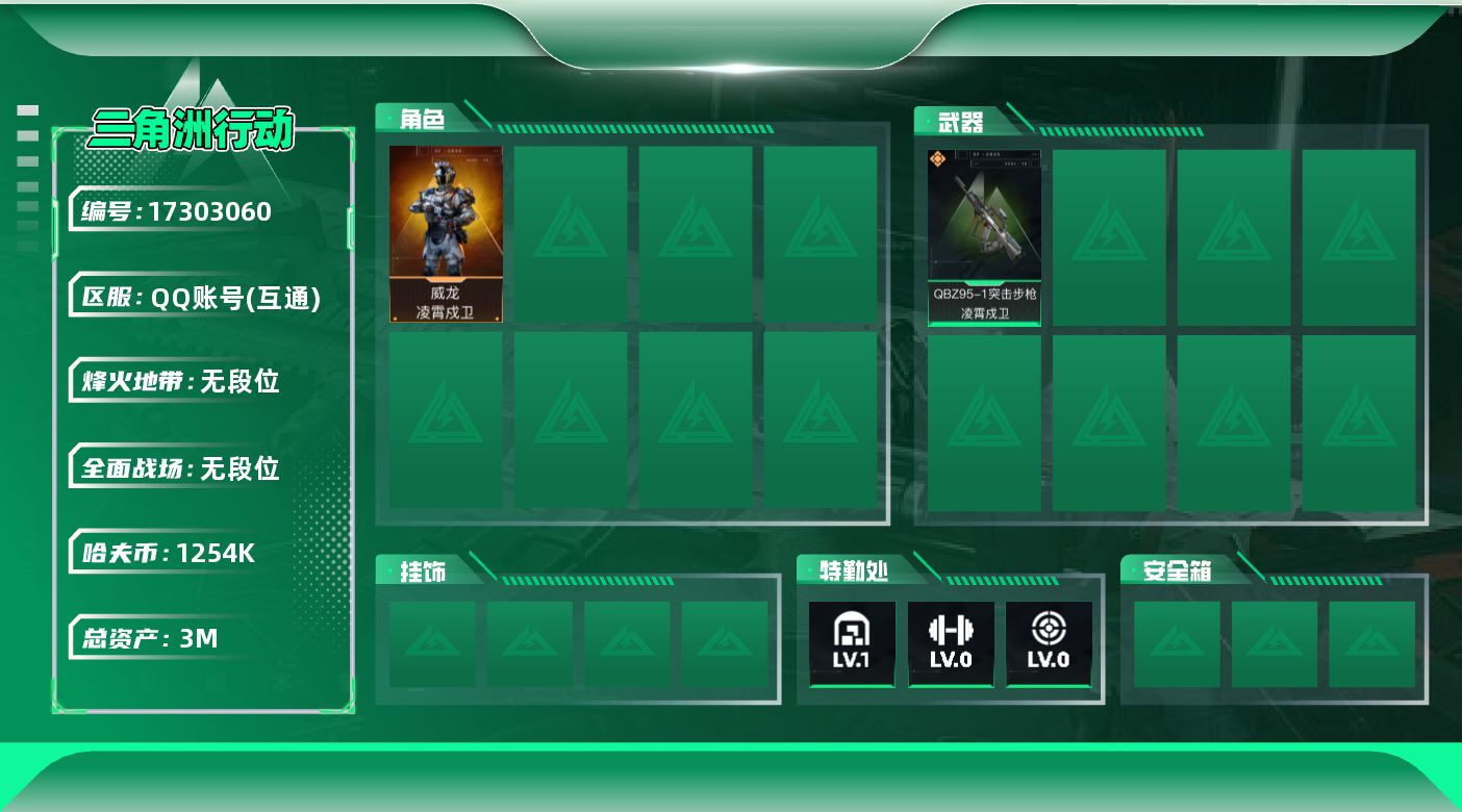 [17303060]3m总资产-1254k哈伏币-5烽火等级-无段位-1战场等级-无军衔 【干员外观】:威龙-凌霄戍卫 【近战皮肤】:近战-黑鹰 【传说外观】:QBZ95-1突击步枪-凌霄戍卫 【稀有外观】:SG552突击步枪-2026 【普通外观】:QBZ95-1突击步枪-2026,G17-2026 【挂饰】:挂饰-凌霄戍卫