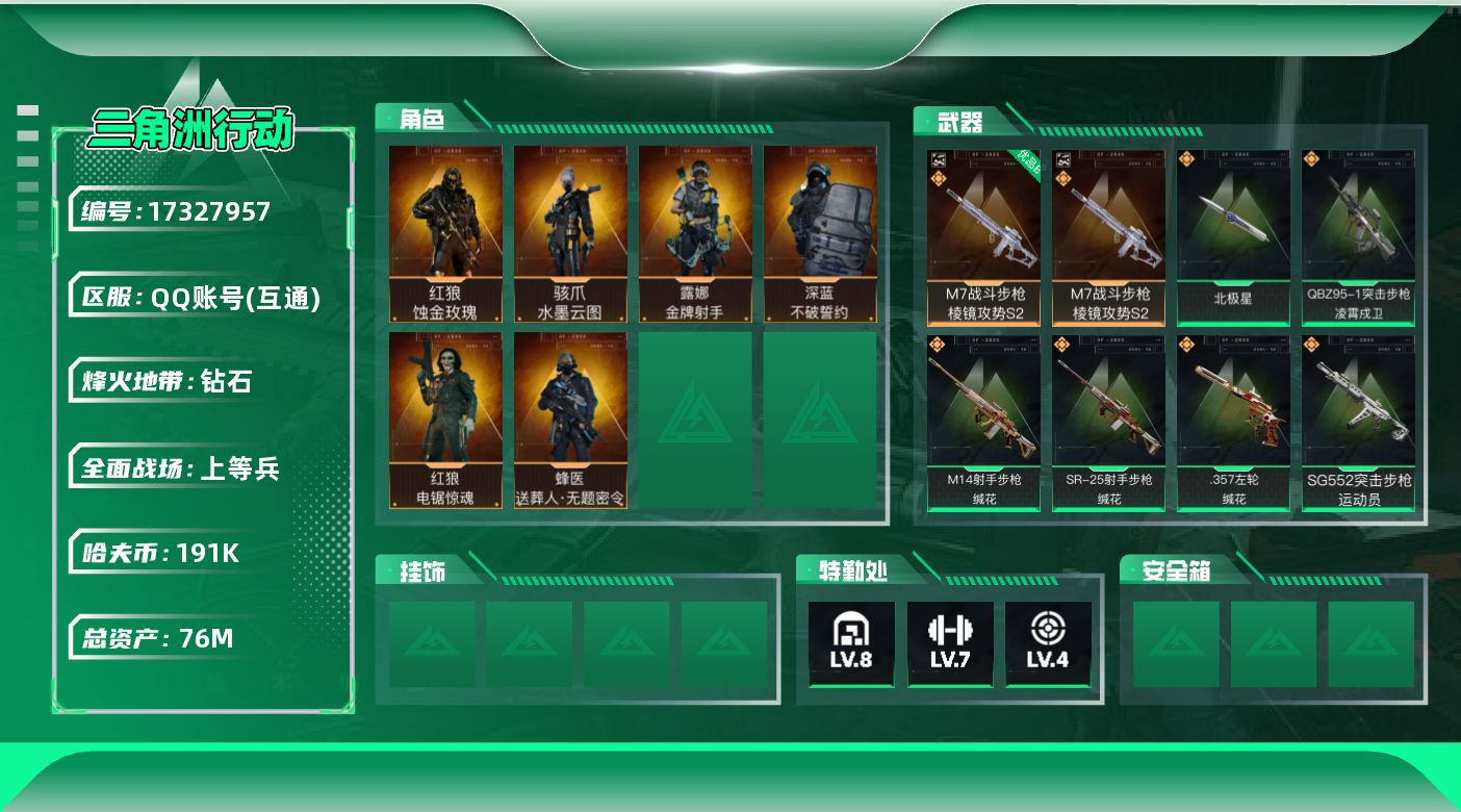 [17327957]【特价出售/店主推荐】76m总资产-191k哈伏币-60烽火等级-钻石-20战场等级-上等兵 【干员外观】:红狼-蚀金玫瑰,骇爪-水墨云图,蜂医-送葬人·无题密令,深蓝-不破誓约,红狼-电锯惊魂,露娜-金牌射手 【近战皮肤】:近战-北极星,近战-黑鹰 【典藏外观】:M7战斗步枪-棱镜攻势S2 【典藏外观成色】:M7战斗步枪-棱镜攻势S2(优品B) 【传说外观】:M4A1突击步枪-蚀金玫瑰,M4A1突击步枪-阿米娅,QBZ95-1突击步枪-凌霄戍卫,ASh-12战斗步枪-鹅鸭杀,SG552突击步枪-运动员,AK-12突击步枪-特斯拉线圈,SCAR-H战斗步枪-水墨云图,SCAR-H战斗步枪-启航,G3战斗步枪-骑士,CAR-15突击步枪-阿米娅,腾龙突击步枪-捞点薯条,K437突击步枪-北极星,KC17突击步枪-电锯惊魂,UZI冲锋枪-特斯拉线圈,SR-3M紧凑突击步枪-特斯拉线圈,勇士冲锋枪-能天使-午夜邮差,QCQ171冲锋枪-北极星,QCQ171冲锋枪-鹅鸭杀,725双管霰弹枪-送葬人-无题密令,M250通用机枪-骑士之心,QJB201轻机枪-鹅鸭杀,M14射手步枪-缄花,SR-25射手步枪-缄花,AWM狙击步枪-捞点薯条,.357左轮-缄花,93R-捞点薯条,复合弓-黑·天际线 【史诗外观】:ASh-12战斗步枪-无极限,M16A4突击步枪-竞赛选手,AUG突击步枪-蝮蛇,M7战斗步枪-百步穿杨,SCAR-H战斗步枪-囚徒,G3战斗步枪-流沙送葬,G3战斗步枪-哈夫克警备,AS Val突击步枪-典狱官,AS Val突击步枪-百步穿杨,腾龙突击步枪-无垢,腾龙突击步枪-猎鳄行动,K437突击步枪-守护者,MP5冲锋枪-战术竞备,MP5冲锋枪-竞技风,Vector冲锋枪-百步穿杨,Vector冲锋枪-异域战争,SR-3M紧凑突击步枪-荒野求生,SR-3M紧凑突击步枪-战术竞备,勇士冲锋枪-工业狂潮,MP7冲锋枪-无垢,MP7冲锋枪-守护者,PKM通用机枪-荒野求生,QJB201轻机枪-炽焰,Mini-14射手步枪-守护者,SVD狙击步枪-荒野求生,PSG-1射手步枪-无垢,SV-98狙击步枪-林中猎手,SV-98狙击步枪-囚徒,M700狙击步枪-蝮蛇,M700狙击步枪-百步穿杨,AWM狙击步枪-无极限,AWM狙击步枪-流沙送葬,复合弓-守护者 【稀有外观】:M4