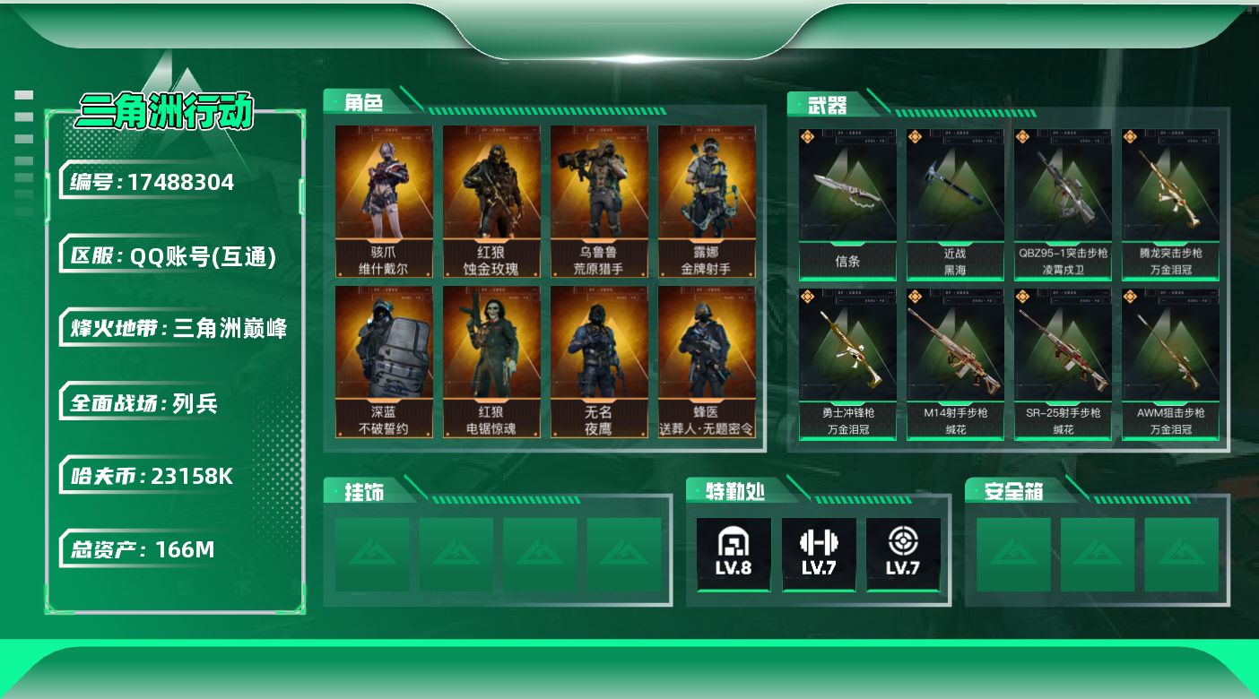 [17488304]【特价出售/店主推荐】166m总资产-23158k哈伏币-60烽火等级-三角洲巅峰-9战场等级-列兵 信条 【干员外观】:红狼-蚀金玫瑰,骇爪-维什戴尔,蜂医-送葬人·无题密令,无名-夜鹰,深蓝-不破誓约,红狼-电锯惊魂,露娜-金牌射手,乌鲁鲁-荒原猎手 【近战皮肤】:近战-信条,近战-黑海,近战-处刑者3级,近战-黑鹰 【传说外观】:M4A1突击步枪-蚀金玫瑰,M4A1突击步枪-阿米娅,QBZ95-1突击步枪-凌霄戍卫,ASh-12战斗步枪-鹅鸭杀,AUG突击步枪-悠然茶歇,SG552突击步枪-运动员,AK-12突击步枪-夜鹰,AK-12突击步枪-特斯拉线圈,SCAR-H战斗步枪-启航,SCAR-H战斗步枪-荼蘼,G3战斗步枪-骑士,CAR-15突击步枪-阿米娅,腾龙突击步枪-捞点薯条,腾龙突击步枪-万金泪冠,KC17突击步枪-电锯惊魂,MK47突击步枪-悠然茶歇,MP5冲锋枪-黑海,P90冲锋枪-信条,UZI冲锋枪-特斯拉线圈,UZI冲锋枪-悠然茶歇,SMG-45冲锋枪-骑士,SR-3M紧凑突击步枪-特斯拉线圈,SR-3M紧凑突击步枪-荼蘼,勇士冲锋枪-能天使-午夜邮差,勇士冲锋枪-万金泪冠,QCQ171冲锋枪-鹅鸭杀,725双管霰弹枪-送葬人-无题密令,PKM通用机枪-荼蘼,M250通用机枪-骑士之心,QJB201轻机枪-黑海,QJB201轻机枪-鹅鸭杀,M14射手步枪-蛮荒,M14射手步枪-缄花,SR-25射手步枪-信条,SR-25射手步枪-缄花,R93狙击步枪-维什戴尔,AWM狙击步枪-捞点薯条,AWM狙击步枪-万金泪冠,.357左轮-缄花,93R-捞点薯条 【史诗外观】:AKM突击步枪-林中猎手,QBZ95-1突击步枪-曙光,ASh-12战斗步枪-守夜人,ASh-12战斗步枪-无极限,K416突击步枪-冬日风情,K416突击步枪-腊梅,M16A4突击步枪-竞赛选手,AUG突击步枪-蝮蛇,M7战斗步枪-禁卫,M7战斗步枪-百步穿杨,SG552突击步枪-尖端治疗,SG552突击步枪-深海恐惧,SG552突击步枪-哈夫克警备,SCAR-H战斗步枪-囚徒,G3战斗步枪-流沙送葬,G3战斗步枪-哈夫克警备,AS Val突击步枪-尖端治疗,AS Val突击步枪-百步穿杨,腾龙突击步枪-无垢,腾龙突击步枪-猎鳄行动,K437突击步枪-守护者,K437突击步枪-丛影谍
