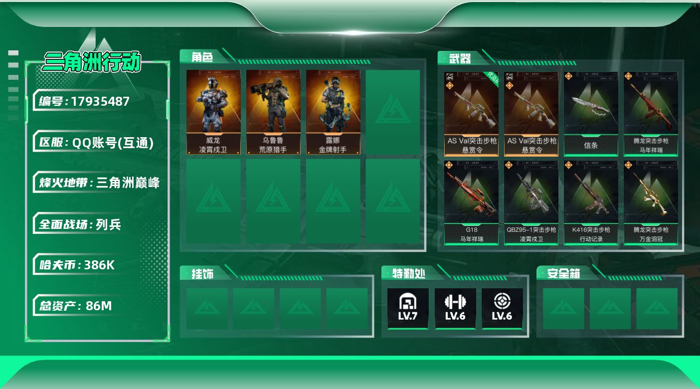 [17935487]86m总资产-386k哈夫币-60烽火等级-三角洲巅峰-12战场等级-列兵 【干员外观】:威龙-凌霄戍卫,露娜-金牌射手,乌鲁鲁-荒原猎手,蛊-不羁人生 【近战皮肤】:近战-信条,近战-黑鹰 【典藏外观】:AS Val突击步枪-悬赏令 【典藏外观成色】:AS Val突击步枪-悬赏令(优品B) 【传说外观】:QBZ95-1突击步枪-凌霄戍卫,K416突击步枪-行动记录,AUG突击步枪-悠然茶歇,SG552突击步枪-运动员,SCAR-H战斗步枪-荼蘼,腾龙突击步枪-马年祥瑞,腾龙突击步枪-万金泪冠,MK47突击步枪-悠然茶歇,P90冲锋枪-信条,UZI冲锋枪-悠然茶歇,SR-3M紧凑突击步枪-荼蘼,勇士冲锋枪-万金泪冠,PKM通用机枪-荼蘼,M14射手步枪-蛮荒,M14射手步枪-缄花,SKS射手步枪-骑士,SR-25射手步枪-信条,SR-25射手步枪-缄花,AWM狙击步枪-万金泪冠,.357左轮-缄花,G18-马年祥瑞 【史诗外观】:QBZ95-1突击步枪-曙光,K416突击步枪-冬日风情,K416突击步枪-腊梅,M7战斗步枪-百步穿杨,G3战斗步枪-流沙送葬,G3战斗步枪-哈夫克警备,AS Val突击步枪-百步穿杨,K437突击步枪-丛影谍踪,MP5冲锋枪-竞技风,Vector冲锋枪-百步穿杨,SMG-45冲锋枪-阿萨拉特攻,SR-3M紧凑突击步枪-开工大吉,勇士冲锋枪-丛影谍踪,MP7冲锋枪-六套之力,PKM通用机枪-阿萨拉特攻,M249轻机枪-丛影谍踪,QJB201轻机枪-炽焰,VSS射手步枪-丛影谍踪,M14射手步枪-工业狂潮, M14射手步枪-航天庆典,SV-98狙击步枪-囚徒,SV-98狙击步枪-猎鳄行动,M700狙击步枪-百步穿杨,M700狙击步枪-哈夫克警备,AWM狙击步枪-流沙送葬 【稀有外观】:M4A1突击步枪-繁盛,AKM突击步枪-肃杀,ASh-12战斗步枪-繁盛,K416突击步枪-一帆风顺,SG552突击步枪-2026,SG552突击步枪-马年新春,SG552突击步枪-贴花艺术, AK-12突击步枪-马年新春,SCAR-H战斗步枪-荣耀列队,G3战斗步枪-主宰,CAR-15突击步枪-来财,KC17突击步枪-前沿科技,KC17突击步枪-来财,MP5冲锋枪-弄臣,MP5冲锋枪-哈夫克卫队,SMG-45冲锋枪-行动开启,SR-3M紧凑突击步枪-马年新