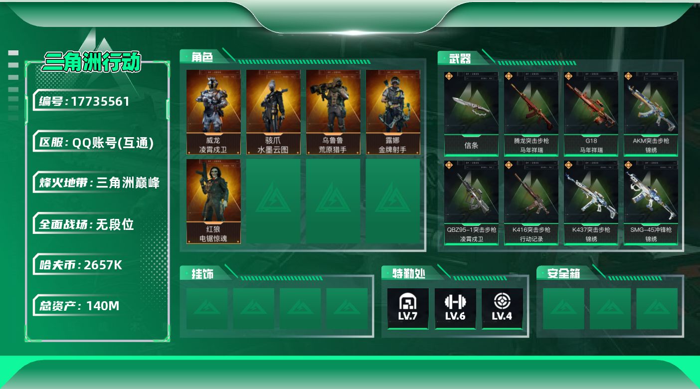 [17735561]140m总资产-2657k哈夫币-60烽火等级-三角洲巅峰-1战场等级-无军衔 【干员外观】:骇爪-水墨云图,威龙-凌霄戍卫,红狼-电锯惊魂,露娜-金牌射手,乌鲁鲁-荒原猎手 【近战皮肤】:近战-信条,近战-黑鹰 【传说外观】:M4A1突击步枪-蚀金玫瑰,M4A1突击步枪-阿米娅,AKM突击步枪-锦绣,QBZ95-1突击步枪-凌霄戍卫,K416突击步枪-行动记录,AUG突击步枪-悠然茶歇,SG552突击步枪-运动员,AK-12突击步枪-特斯拉线圈,SCAR-H战斗步枪-水墨云图,SCAR-H战斗步枪-启航,CAR-15突击步枪-阿米娅,腾龙突击步枪-捞点薯条,腾龙突击步枪-马年祥瑞,K437突击步枪-锦绣,KC17突击步枪-电锯惊魂,MK47突击步枪-悠然茶歇,P90冲锋枪-信条,Vector冲锋枪-能天使-午夜邮差,UZI冲锋枪-特斯拉线圈,UZI冲锋枪-悠然茶歇,SMG-45冲锋枪-锦绣,SR-3M紧凑突击步枪-特斯拉线圈,勇士冲锋枪-能天使-午夜邮差,PKM通用机枪-荼蘼,M250通用机枪-骑士之心,M14射手步枪-蛮荒,M14射手步枪-缄花,SKS射手步枪-骑士,SR-25射手步枪-信条,SR-25射手步枪-缄花,AWM狙击步枪-捞点薯条,.357左轮-缄花,G18-马年祥瑞,93R-捞点薯条 【史诗外观】:ASh-12战斗步枪-无极限,K416突击步枪-冬日风情,K416突击步枪-腊梅,M7战斗步枪-百步穿杨,SCAR-H战斗步枪-囚徒,G3战斗步枪-流沙送葬,G3战斗步枪-哈夫克警备,AS Val突击步枪-百步穿杨,腾龙突击步枪-猎鳄行动,K437突击步枪-守护者,K437突击步枪-丛影谍踪,MP5冲锋枪-战术竞备,P90冲锋枪-紧急戒备,Vector冲锋枪-猎鳄行动,Vector冲锋枪-百步穿杨,SMG-45冲锋枪-阿萨拉特攻,SR-3M紧凑突击步枪-战术竞备,SR-3M紧凑突击步枪-开工大吉,勇士冲锋枪-深海恐惧,勇士冲锋枪-丛影谍踪,MP7冲锋枪-守护者,MP7冲锋枪-六套之力,PKM通用机枪-蝮蛇,M249轻机枪-丛影谍踪,M250通用机枪-囚徒,QJB201轻机枪-炽焰,QJB201轻机枪-Old Habits,Mini-14射手步枪-守护者,VSS射手步枪-丛影谍踪,M14射手步枪-工业狂潮, M14射手步枪-航天庆典,SV-98狙击步枪-