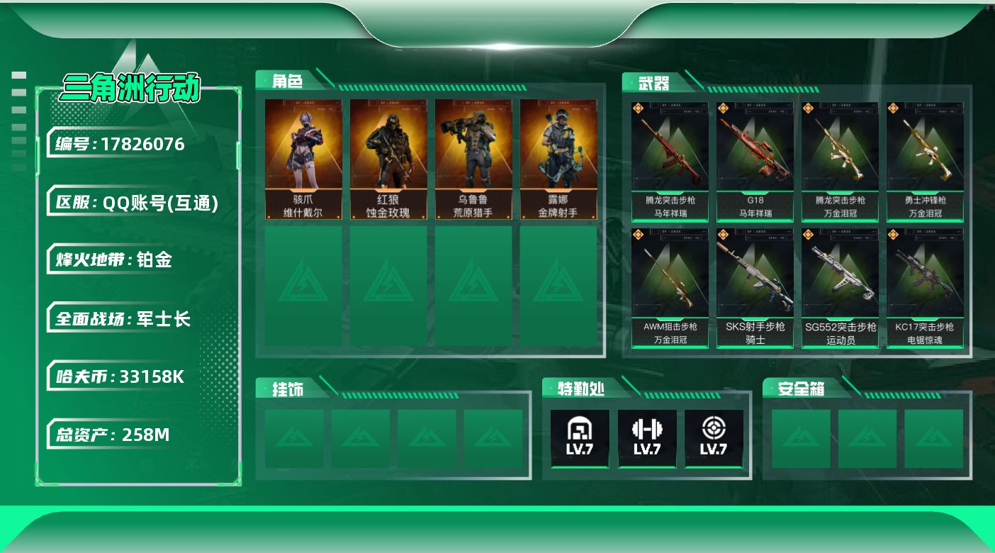 [17826076]258m总资产-33158k哈夫币-60烽火等级-铂金-26战场等级-军士长 【干员外观】:红狼-蚀金玫瑰,骇爪-维什戴尔,露娜-金牌射手,乌鲁鲁-荒原猎手 【近战皮肤】:近战-黑鹰 【传说外观】:M4A1突击步枪-蚀金玫瑰,M7战斗步枪-怜悯,M7战斗步枪-巳蛇,SG552突击步枪-运动员,SCAR-H战斗步枪-启航,腾龙突击步枪-马年祥瑞,腾龙突击步枪-万金泪冠,KC17突击步枪-电锯惊魂,勇士冲锋枪-万金泪冠,M14射手步枪-蛮荒,SKS射手步枪-骑士,R93狙击步枪-维什戴尔,AWM狙击步枪-万金泪冠,G18-马年祥瑞 【史诗外观】:QBZ95-1突击步枪-曙光,K416突击步枪-冬日风情,K416突击步枪-腊梅,M7战斗步枪-百步穿杨,SG552突击步枪-哈夫克警备,G3战斗步枪-流沙送葬,G3战斗步枪-哈夫克警备,AS Val突击步枪-百步穿杨,腾龙突击步枪-猎鳄行动,K437突击步枪-丛影谍踪,MP5冲锋枪-深海恐惧,MP5冲锋枪-战术竞备,MP5冲锋枪-竞技风,Vector冲锋枪-百步穿杨,Vector冲锋枪-异域战争,SMG-45冲锋枪-阿萨拉特攻,SR-3M紧凑突击步枪-开工大吉,勇士冲锋枪-深海恐惧,勇士冲锋枪-丛影谍踪,MP7冲锋枪-六套之力,S12K霰弹枪-曙光,M249轻机枪-丛影谍踪,M250通用机枪-囚徒,QJB201轻机枪-炽焰,VSS射手步枪-丛影谍踪,M14射手步枪-工业狂潮, M14射手步枪-航天庆典,M700狙击步枪-百步穿杨,M700狙击步枪-哈夫克警备,AWM狙击步枪-流沙送葬 【稀有外观】:M4A1突击步枪-零点,M4A1突击步枪-繁盛,AKM突击步枪-肃杀,QBZ95-1突击步枪-公平竞技,ASh-12战斗步枪-繁盛,K416突击步枪-碳纤维,K416突击步枪-一帆风顺,M7战斗步枪-捣蛋鬼,SG552突击步枪-2026,SG552突击步枪-马年新春,SG552突击步枪-贴花艺术,AK-12突击步枪-零点, AK-12突击步枪-马年新春,SCAR-H战斗步枪-荣耀列队,G3战斗步枪-主宰,CAR-15突击步枪-亚特兰蒂斯,CAR-15突击步枪-来财,KC17突击步枪-来财,MK47突击步枪-冰河潜伏者,MP5冲锋枪-哈夫克卫队,Vector冲锋枪-先锋,UZI冲锋枪-前沿科技,UZI冲锋枪-亚特兰蒂斯,野牛冲锋枪-