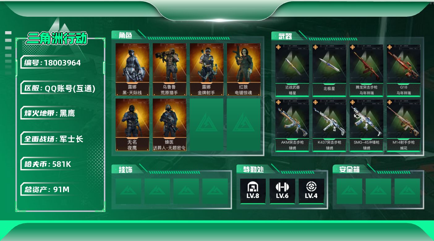 [18003964]【特价出售/店主推荐】91m总资产-581k哈夫币-60烽火等级-黑鹰-24战场等级-军士长