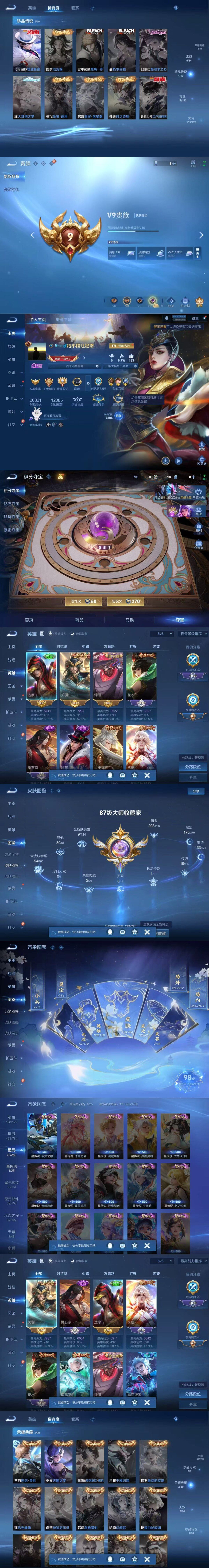 亚瑟狮心王,庄周蜃楼王,孙膑妖精王,扁鹊炼金王,虞姬凯尔特女王,白起狰,太乙真人饕餮,曹操烛龙,芈月重明,典韦穷奇,狂铁御狮,米莱狄御霄,牛魔御旌,盾山御銮,夏侯惇朔风刀,明世隐疑决卦,老夫子醍醐杖,鬼谷子原初探秘者,狄仁杰万华元夜,程咬金演武夺筹,钟馗驱傩正仪,苏烈千军破阵,吕布猎兽之王,嬴政白昼王子,女娲朔望之晖,典韦蓝屏警告,钟馗神迹守卫,鲁班七号狮舞东方,沈梦溪星空之诺,李元芳银河之约,刘邦夺宝奇兵,马可波罗暗影游猎,蒙犽狂想玩偶喵,元歌云间偶戏,弈星混沌棋,达摩沙漠行僧,兰陵王金庭之子,沈梦溪大漠名商,李元芳云中旅人,桑启海盐诗旅,裴擒虎擒涛扼浪,鲁班大师探海日志,张良古海寻踪