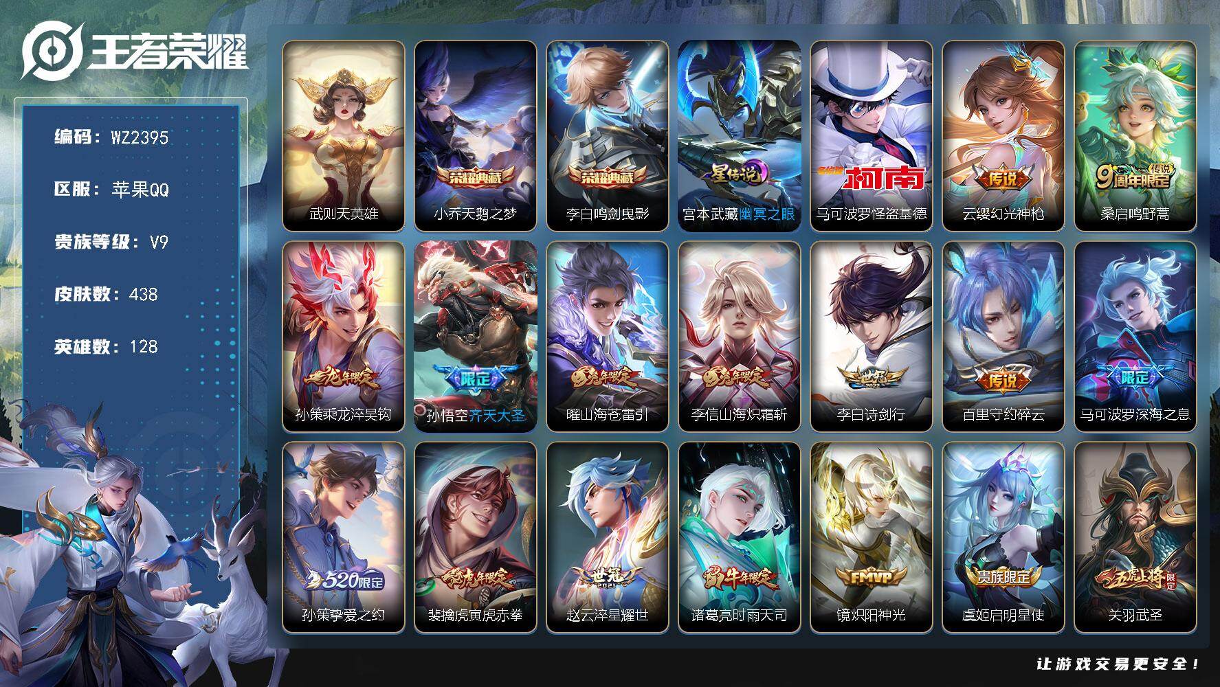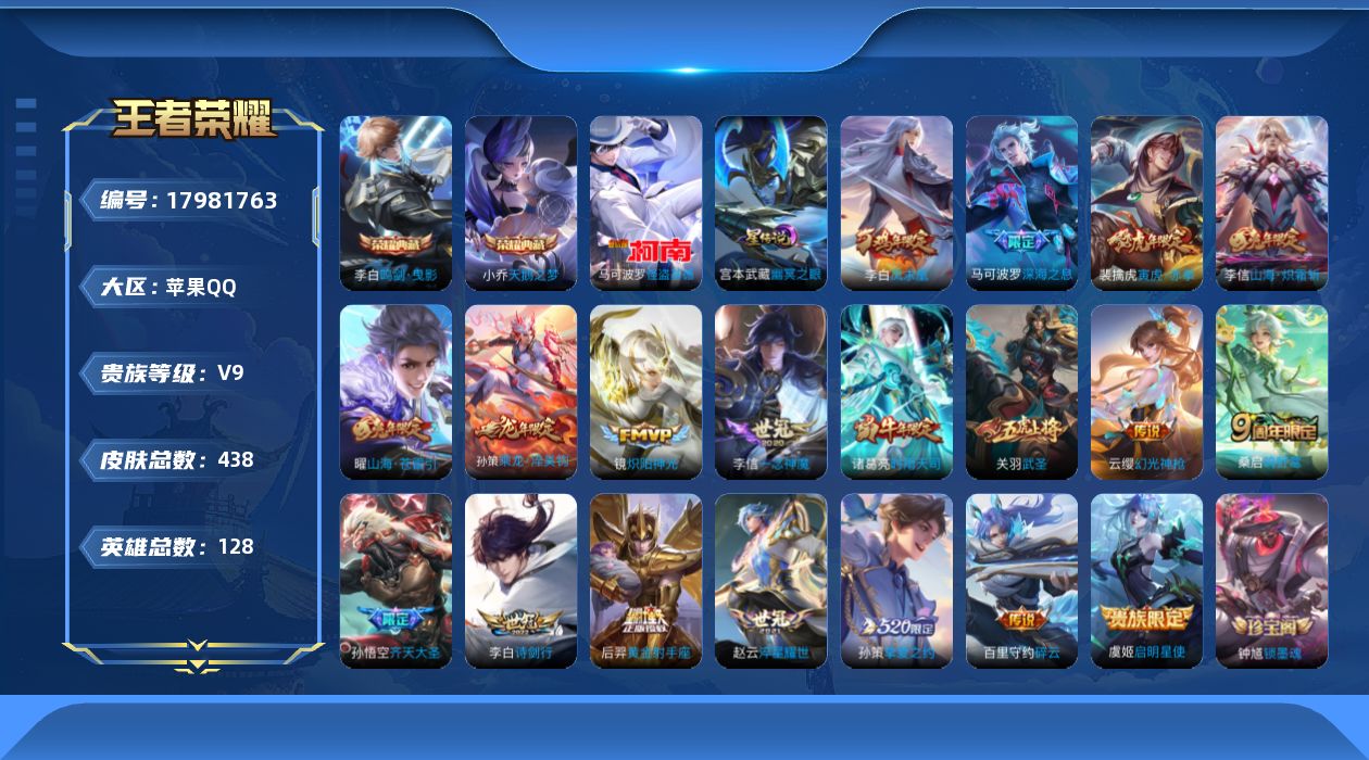 [17981763]苹果Q-V9-最强王者段位-128英雄-438皮肤-2典藏皮肤-1典藏英雄-1珍品传说-19传说-132史诗