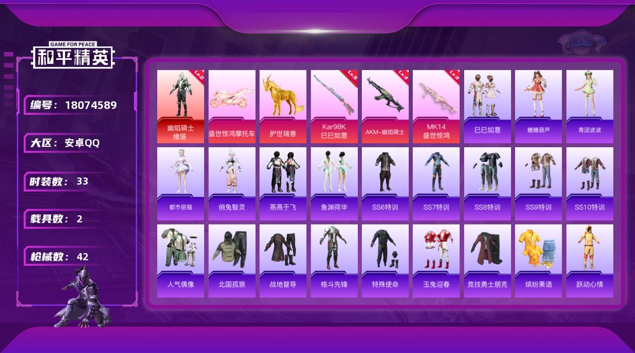 [18074589]【店主推荐捡漏号!可直接换绑】安卓 手Q-1神装-0粉装-3特效枪-2载具-5粉色飞行器-19404热力值-2王牌印记-33套装-42枪皮【红色神装等级】:幽焰骑士-维塔(二级)【红色角色神装】:幽焰骑士-维塔【粉色枪皮等级】:AKM-幽焰骑士(三级),Kar98K-巳巳如意(五级),Mk14-盛世惊鸿(三级)【粉色载具】:盛世惊鸿摩托车,护世瑞兽【粉色枪皮】:AKM-幽焰骑士,Kar98K-巳巳如意,Mk14-盛世【粉色飞行器】:酣梦熊熊飞行器,龙翔九天飞行器,幽焰列车飞行器,凤舞九天飞行器