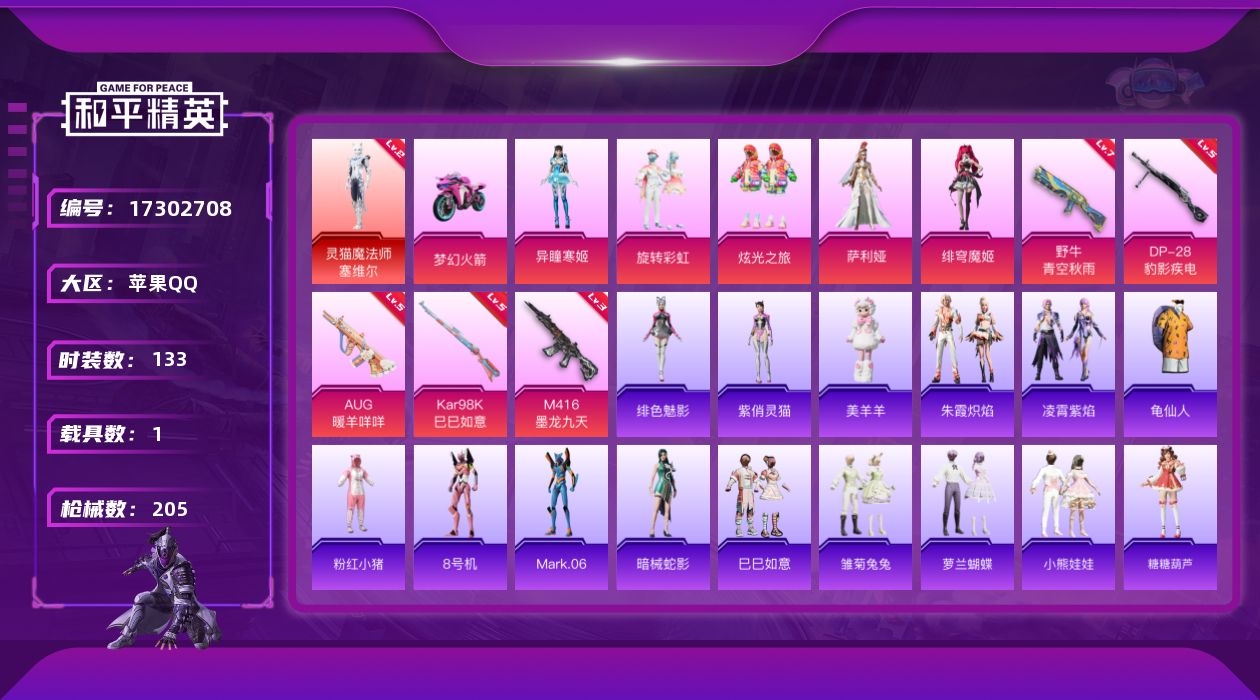 [17302708]【店主推荐捡漏号!可直接换绑】苹果 手Q-1神装-5粉装-5特效枪-1载具-3粉色飞行器-65381热力值-9王牌印记-133套装-205枪皮【红色神装等级】:灵猫魔法师-塞维尔(二级)【红色角色神装】:灵猫魔法师-塞维尔【热门品类】:套装-龟仙人,套装-粉红小猪,角色-8号机,角色-Mark.06【粉色套装】:粉装-旋转彩虹,粉装-炫光之旅,角色-萨利娅,角色-绯穹魔姬,角色-异瞳寒姬【粉色枪皮等级】:M416-墨龙九天(三级),AUG-暖羊咩咩(五级),野牛-青空秋雨(七级),Kar98K-巳巳如意(五级),DP-28-豹影疾电(五级)【粉色载具】:双人摩托-梦幻火箭【粉色枪皮】:M416-墨龙九天,AUG-暖羊咩咩,野牛-青空秋雨,Kar98K-巳巳如意,DP-28-豹影疾电【粉色飞行器】:梦幻火箭飞行器,镜域双华-灵镜之阶,飞天猪飞行器