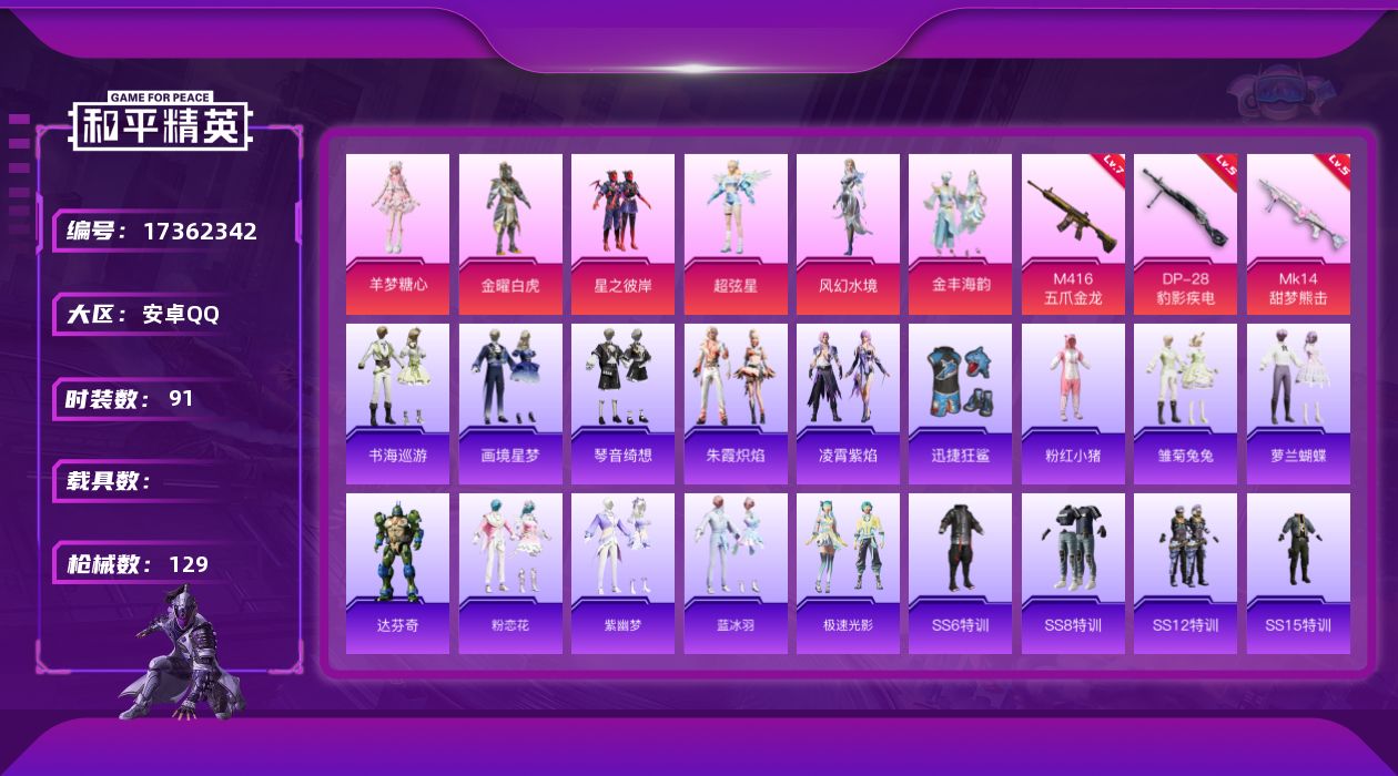 [17362342]【特价出售/店主推荐】安卓 手Q-6粉装-6特效枪-0载具-2粉色飞行器-39570热力值-2王牌印记-91套装-129枪皮