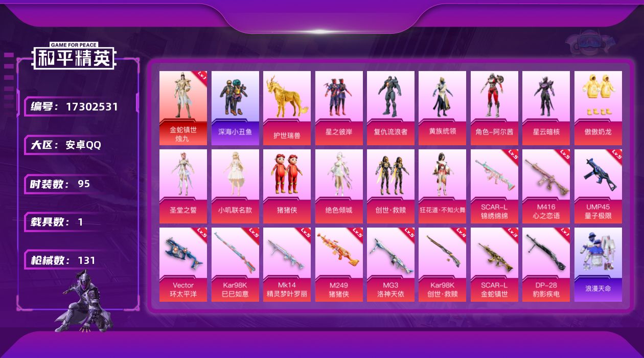 [17302531]安卓 手Q-1神装-12粉装-11特效枪-1载具-8粉色飞行器-49439热力值-4王牌印记-95套装-131枪皮 【红色神装等级】:金蛇镇世-烛九(一级) 【红色角色神装】:金蛇镇世-烛九 【热门品类】:套装-浪漫天命,套装-深海小丑鱼,角色-军刀雅典娜,角色-忠猛周仓,角色-忠真马岱,角色-忠义严颜,套装-龟仙人,套装-暗影哥特,角色-Mark.06,大砍刀-青龙偃月刀,撬棍-龙胆亮银枪 【粉色套装】:粉装-星之彼岸,角色-复仇流浪者,粉装-黄族统领,角色-阿尔茜,角色-星云暗核,粉装-傲傲奶龙,角色-圣堂之誓,角色-小叽联名款,玩偶服-猪猪侠,角色-绝色倾城,套装-创世·救赎,角色-狂花道·不知火舞 【粉色枪皮等级】:SCAR-L-锦绣绵绵(五级),SCAR-L-金蛇镇世(三级),M416-心之恋语(五级),UMP45-量子极限(五级),Vector-环太平洋(五级),Kar98K-创世·救赎(四级),Kar98K-巳巳如意(五级),Mk14-精灵梦叶罗丽(五级),M249-猪猪侠(五级),DP-28-豹影疾电(一级),MG3-洛神天依(五级) 【粉色载具】:护世瑞兽 【粉色枪皮】:SCAR-L-锦绣绵绵,SCAR-L-金蛇镇世,M416-心之恋语,UMP45-量子极限,Vector-环太平洋,Kar98K-创世·救赎,Kar98K-巳巳如意,Mk14-精灵梦叶罗丽,M249-猪猪侠,DP-28-豹影疾电,MG3-洛神天依 【粉色飞行器】:青春物语飞行器,黄族统领飞行器,祥瑞锦鲤飞行器,花傲天飞行器,镜域双华-灵镜之阶,绝色倾城飞行器,星空武士飞行器,万象金身飞行器 【粉色降落伞】:快乐主宰降落伞,星之彼岸降落伞,洛神天依降落伞,环太平洋降落伞,黄族统领降落伞,未来歌姬降落伞,猪猪侠降落伞,繁龙极客降落伞,绝色倾城降落伞,江南烟雨降落伞,精灵梦叶罗丽降落伞,创世·救赎降落伞,守护天翼降落伞,金蛇镇世降落伞,幻影飞狐降落伞,月下星之子降落伞 【稀有套装】:套装-龟仙人,套装-摩登天骄,套装-巳巳如意,套装-晶辉守护,套装-旋风灵鼠 【稀有枪皮】:AKM-影袭,AKM-环太平洋,AKM-霓虹街区,AKM-龙的传人,M16A4-莲影清波,SCAR-L-幽秘魅影,SCAR-L-是爱神辣,M416-动感兔斯基,M416-糯团青竹,M416-绯红前夜,M416-蓝色火焰