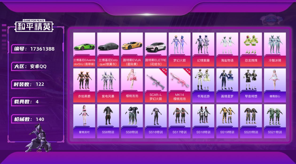 [17361388]【特价出售/店主推荐】安卓 手Q-8粉装-5特效枪-4载具-3粉色飞行器-55769热力值-2王牌印记-122套装-140枪皮【热门品类】:粉装-梦幻火箭【粉色套装】:粉装-梦幻火箭,粉装-幻情紫藤,粉装-海盐物语,粉装-恐龙拽拽,粉装-冷魅冰骑,粉装-赤焰黑爵,粉装-紫电风暴,角色-樱桃泡泡【粉色枪皮等级】:SCAR-L-梦幻火箭(七级),AKS-74U-森灵之息(五级),Mk14-樱桃泡泡(三级),Mk14-福马献瑞(五级),信号枪-金乌曜日(五级)【粉色载具】:兰博基尼Aventador SVJ(翡翠绿),兰博基尼Estoque(银翼灰),路特斯EVIJA(星际黄),路特斯ELETRE(花绽灰)【粉色枪皮】:SCAR-L-梦幻火箭,AKS-74U-森灵之息,Mk14-樱桃泡泡,Mk14-福马献瑞,信号枪-金乌曜日【粉色飞行器】:冷魅冰骑飞行器,极意拳锋飞行器