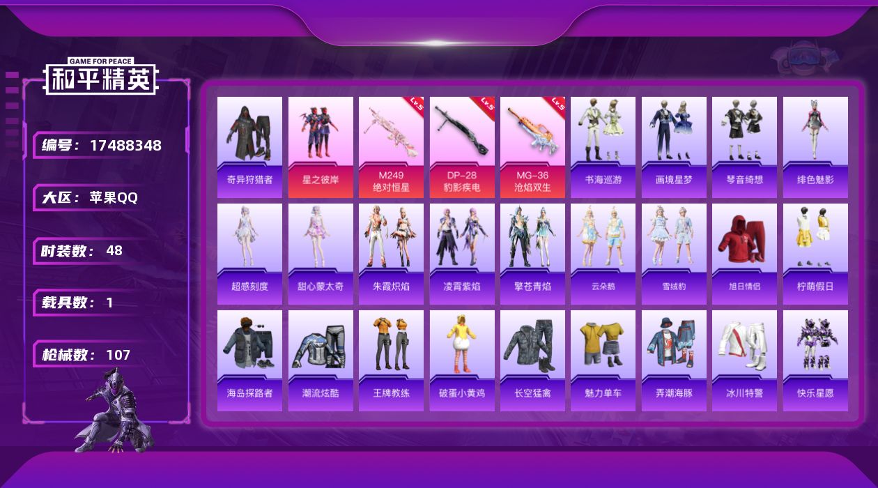 [17488348]可 二次【特价出售/店主推荐】苹果 手Q-1粉装-6特效枪-1载具-2粉色飞行器-25399热力值-4王牌印记-48套装-107枪皮 【热门品类】:套装-奇异狩猎者 【粉色套装】:粉装-星之彼岸 【粉色枪皮等级】:ACE32-萌骑漫游(二级),AKS-74U-森灵之息(五级),Mk14-福马献瑞(五级),M249-绝对恒星(五级),DP-28-豹影疾电(五级),MG-36-沧焰双生(五级) 【粉色载具】:法拉利Roma(纽博格林银) 【粉色枪皮】:ACE32-萌骑漫游,AKS-74U-森灵之息,Mk14-福马献瑞,M249-绝对恒星,DP-28-豹影疾电,MG-36-沧焰双生 【粉色飞行器】:炫彩糖果飞行器,极意拳锋飞行器 【粉色降落伞】:绝对恒星降落伞,星之彼岸降落伞,冷漠罗丽降落伞,智趣喵喵降落伞,炫彩糖果降落伞 【稀有套装】:角色-超感刻度,角色-甜心蒙太奇,套装-雪国风尚,套装-炫彩糖果,角色-罗莉,套装-马上有钱,套装-云朵鹅,套装-雪绒豹,套装-朱霞炽焰,套装-凌霄紫焰,套装-擎苍青焰,角色-绯色魅影,套装-书海巡游,套装-画境星梦,套装-琴音绮想,角色-月烬之祷,套装-雨过天青,套装-红釉青花 【稀有枪皮】:AUG-冰晶雪宝,AKM-破晓战魂,AKM-龙的传人,M16A4-红色方程式,M16A4-蓝色火焰,SCAR-L-夜灯,SCAR-L-炫彩节奏,SCAR-L-玉兔迎春,SCAR-L-红色方程式,M416-红色方程式,M416-蓝色火焰,AUG-耀粉歌者,AUG-绝对恒星,M762-天降萌叽,M762-云朵鹅,M762-登顶巅峰,ACE32-画境星梦,ARX-凌霄紫焰,UZI-天降萌叽,UZI-影袭,UZI-红色方程式,UMP45-夜灯,汤姆逊-耀粉歌者,汤姆逊-像素花束,MP5K-画境星梦,JS9-凌霄紫焰,Kar98K-红色方程式,M24-影袭,AWM-雷霆特警,VSS-星之彼岸,Mini14-耀粉歌者,Mk14-魔药课室,AMR-喜羊羊与灰太狼,SVD-云朵鹅,M1加兰德-画境星梦,S686-奇异狩猎者,S686-红色方程式,S1897-炫彩节奏,S12K-夜灯,AA12-G-画境星梦,SPAS-12-云朵鹅,M249-彩虹符号,M249-星之彼岸,M249-糯团青竹,MG3-幻世战舞者,MG-36-凌霄紫焰,P92-凌霄紫焰,沙漠之鹰-云朵