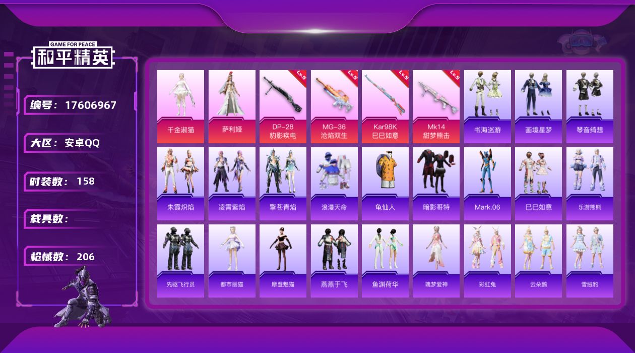 [17606967]可二次【特价出售/店主推荐】安卓 手Q-2粉装-6特效枪-2粉色飞行器-58474热力值-10王牌印记-158套装-206枪皮【热门品类】:套装-浪漫天命,套装-龟仙人,套装-暗影哥特,角色-Mark.06【粉色套装】:角色-千金淑猫,角色-萨利娅【粉色枪皮等级】:UMP45-萌骑冒险(五级),Kar98K-巳巳如意(五级),Mk14-甜梦熊击(五级),Mk14-福马献瑞(五级),DP-28-豹影疾电(五级),MG-36-沧焰双生(五级)【粉色枪皮】:UMP45-萌骑冒险,Kar98K-巳巳如意,Mk14-甜梦熊击,Mk14-福马献瑞,DP-28-豹影疾电,MG-36-沧焰双生【粉色飞行器】:炫彩糖果飞行器,齐天大圣飞行器