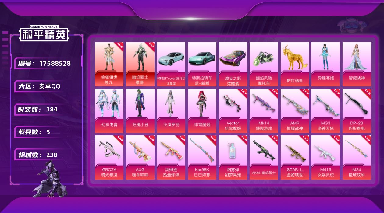 [17588528]【特价出售/店主推荐】/绝世印记6 安卓 手Q-2神装-7粉装-16特效枪-5载具-10粉色飞行器-92760热力值-9王牌印记-184套装-238枪皮【红色神装等级】:金蛇镇世-烛九(三级),幽焰骑士-维塔(一级)【粉色套装】:角色-智耀战神,粉装-幻彩电音,角色-狂魇小丑,角色-冷漠罗丽,角色-绯穹魔姬,角色-异瞳寒姬,角色-虎痴许褚【粉色枪皮等级】:AKM-幽焰骑士(三级),SCAR-L-金蛇镇世(三级),M416-女娲灵识(三级),GROZA-镜光银凌(五级),AUG-暖羊咩咩(五级),Vector-绯穹魔姬(七级),汤姆逊-热量炸弹(五级),Kar98K-巳巳如意(五级),M24-镜域双华(三级),Mk14-盛世惊鸿(三级),Mk14-爆裂游戏(七级),Mk14-福马献瑞(五级),AMR-智耀战神(七级),DP-28-豹影疾电(五级),MG3-洛神天依(七级),烟雾弹-甜梦果泡(五级)【粉色载具】:特斯拉Roadster(水滴蓝),保时捷Taycan 旅行版(冰晶蓝),虚妄之影(炫耀紫),幽焰风驰摩托车,护世瑞兽【粉色枪皮】:AKM-幽焰骑士,SCAR-L-金蛇镇世,M416-女娲灵识,GROZA-镜光银凌,AUG-暖羊咩咩,Vector-绯穹魔姬,汤姆逊-热量炸弹,Kar98K-巳巳如意,M24-镜域双华,Mk14-盛世惊鸿,Mk14-爆裂游戏,Mk14-福马献瑞,AMR-智耀战神,DP-28-豹影疾电,MG3-洛神天依,烟雾弹-甜梦果泡【粉色飞行器】:酣梦熊熊飞行器,炫彩糖果飞行器,祥瑞起舞飞行器,沙丘之主天马,镜域双华-灵镜之阶,龙翔九天飞行器,幽焰列车飞行器,凤舞九天飞行器,万象金身飞行器,灵珠游龙飞行器
