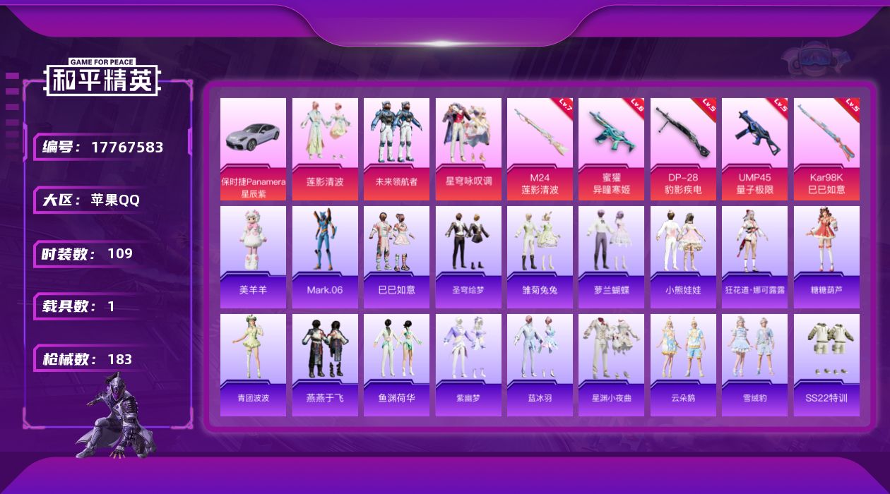 [17767583]【特价出售/店主推荐】苹果 手Q-3粉装-8特效枪-1载具-4粉色飞行器-50658热力值-13王牌印记-109套装-183枪皮【热门品类】:绝对防御上衣,角色-Mark.06【粉色套装】:粉装-莲影清波,粉装-未来领航者,粉装-星穹咏叹调【粉色枪皮等级】:蜜獾-异瞳寒姬(六级),ACE32-萌骑漫游(五级),UMP45-量子极限(五级),AKS-74U-森灵之息(四级),Kar98K-巳巳如意(五级),M24-莲影清波(七级),Mk14-福马献瑞(五级),DP-28-豹影疾电(五级)【粉色载具】:保时捷Panamera(星辰紫)【粉色枪皮】:蜜獾-异瞳寒姬,ACE32-萌骑漫游,UMP45-量子极限,AKS-74U-森灵之息,Kar98K-巳巳如意,M24-莲影清波,Mk14-福马献瑞,DP-28-豹影疾电【粉色飞行器】:炫彩糖果飞行器,BEARBRICK飞行器,时光之吻飞行器,极意拳锋飞行器