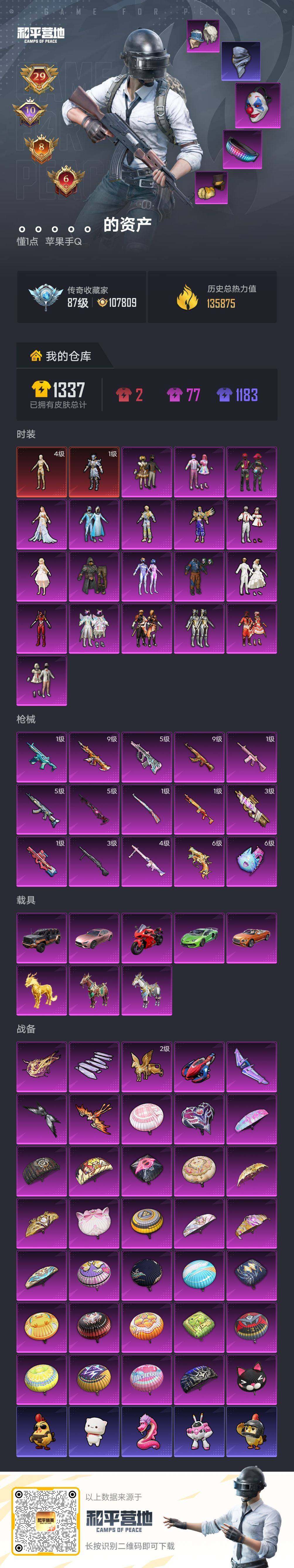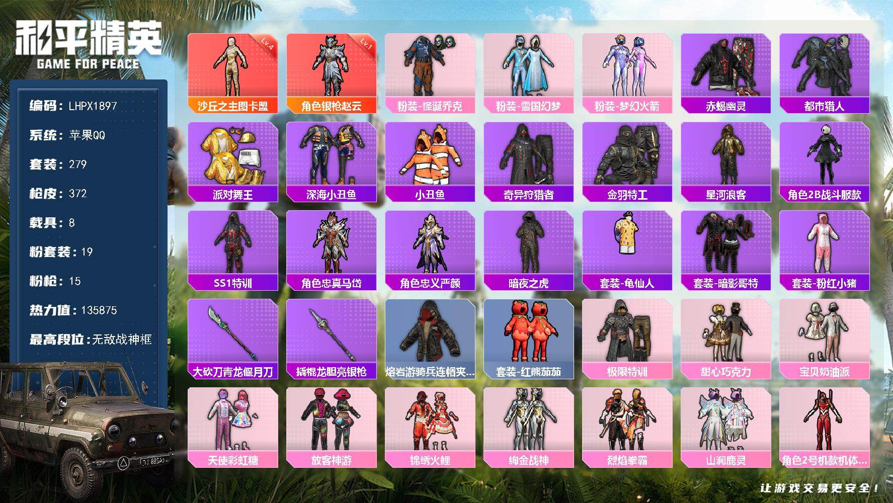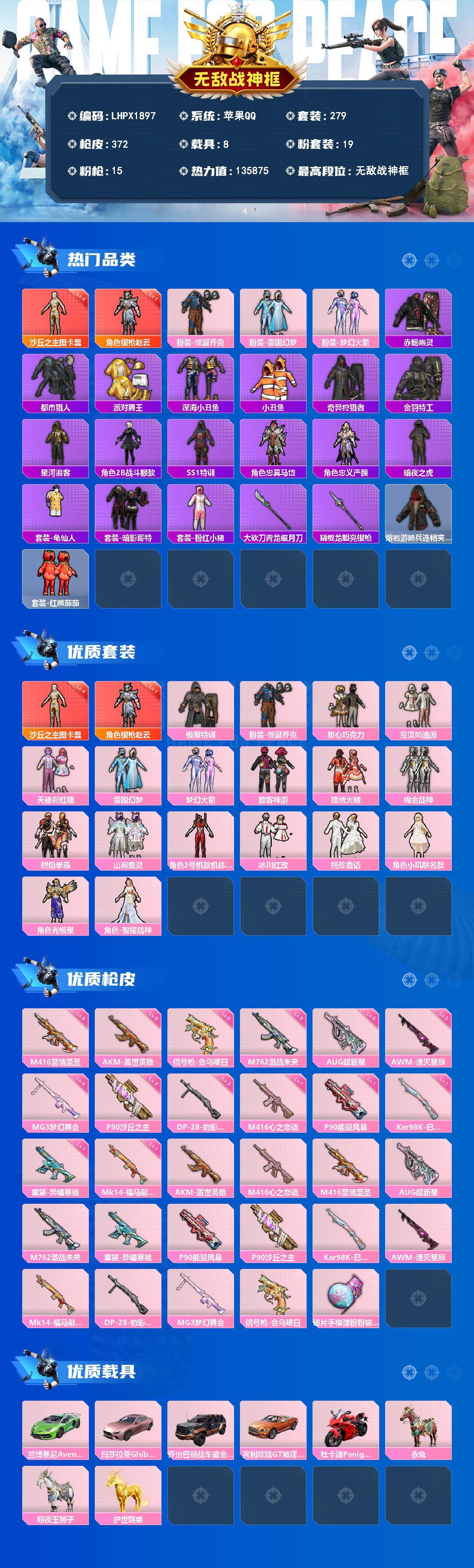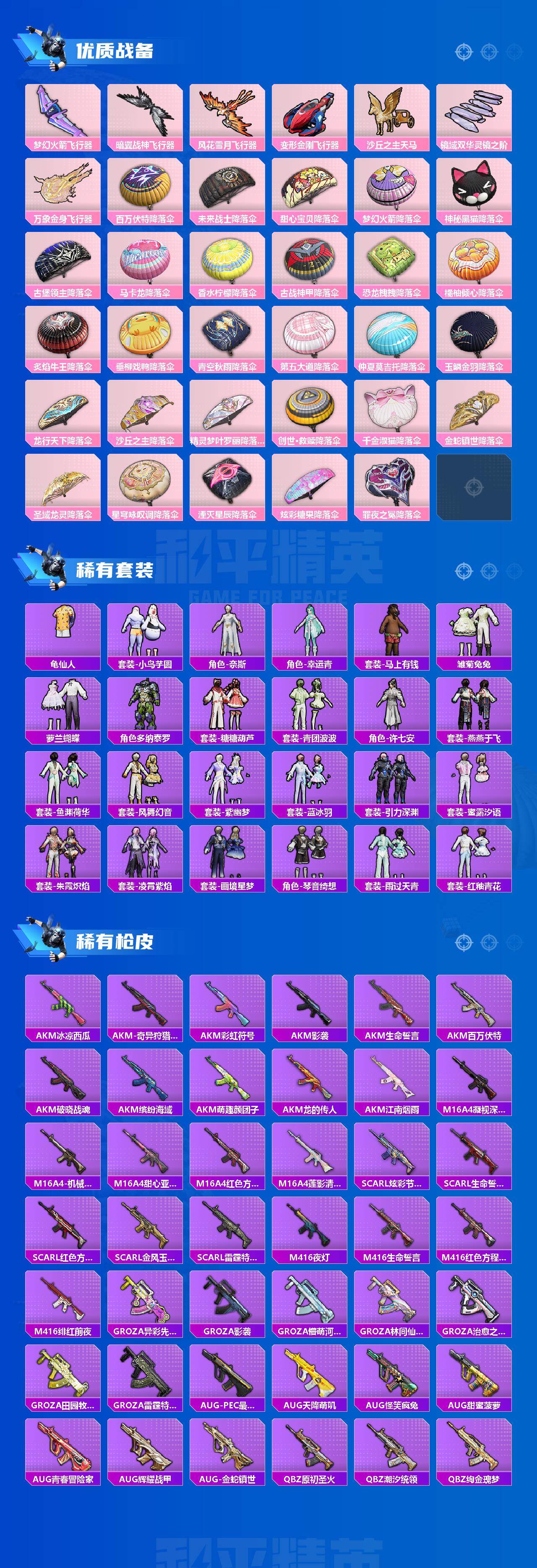 - [16142873]【特价出售/店主推荐】巡查服苹果 手Q-2粉装-3特效枪-0载具-0粉色飞行器-56871热力值-13王牌印记-162套装-188枪皮 【热门品类】:绝对防御上衣,套装-浪漫天命,套装-金羽特工,套装-龟仙人,套装-粉红小猪 【粉色套装】:粉装-未来战士,粉装-寒光使者 【粉色枪皮等级】:SCAR-L-青春物语(七级),Kar98K-巳巳如意(五级),DP-28-豹影疾电(五级) 【粉色枪皮】:SCAR-L-青春物语,Kar98K-巳巳如意,DP-28-豹影疾电 【粉色降落伞】:未来战士降落伞,四圣焕新降落伞,马卡龙降落伞,阿狸红降落伞,夏日绵绵冰降落伞,洛神天依降落伞,炙焰牛王降落伞,星夜魔法师降落伞,圣光天使降落伞,垂柳戏鸭降落伞,旋转彩虹降落伞,临安公主降落伞,异瞳寒姬降落伞 【稀有套装】:套装-龟仙人,套装-巳巳如意,角色-怀庆长公主,套装-燕燕于飞,套装-鱼渊荷华,套装-雪绒豹,角色-夜瞳黯灵,套装-朱霞炽焰,套装-凌霄紫焰,套装-擎苍青焰,玩偶服-懒羊羊 【稀有枪皮】:AKM-夜灯,AKM-彩虹符号,AKM-破晓战魂,AKM-虎虎生威,AKM-霓虹街区,AKM-龙的传人,M16A4-幻世战舞者,M16A4-甜心亚梦,SCAR-L-扶摇飞仙,SCAR-L-未来战士,SCAR-L-炫彩节奏,SCAR-L-玉兔迎春,M416-夜灯,M416-滑板小狐,M416-糯团青竹,M416-红色方程式,M416-绯红前夜,M416-蓝色火焰,GROZA-异彩先驱,GROZA-彩虹符号,GROZA-春暖花开,GROZA-治愈之星,GROZA-田园牧歌,AUG-耀粉歌者,AUG-月影灵韵,QBZ-原初圣火,QBZ-彩虹符号,QBZ-飞驰魅影,M762-天降萌叽,M762-奇异狩猎者,M762-彩虹符号,M762-牛气冲天,M762-瑞龙福将,M762-绯红前夜,M762-镭射皇者,M762-云朵鹅,Mk47-洛神天依,G36C-暗夜玫瑰,AC-VAL-天降萌叽,AC-VAL-甜心亚梦,蜜獾-天降萌叽,蜜獾-娇憨猪猪,ARX-凌霄紫焰,UZI-啾咪啾咪,UZI-天降萌叽,UZI-娇憨猪猪,UMP45-夜灯,UMP45-涂山之恋,UMP45-生命誓言,UMP45-诡娃娃,Vector-彩虹符号,Vector-治愈之星,Vector-生命誓言,Vector-田园牧歌,汤姆逊-天