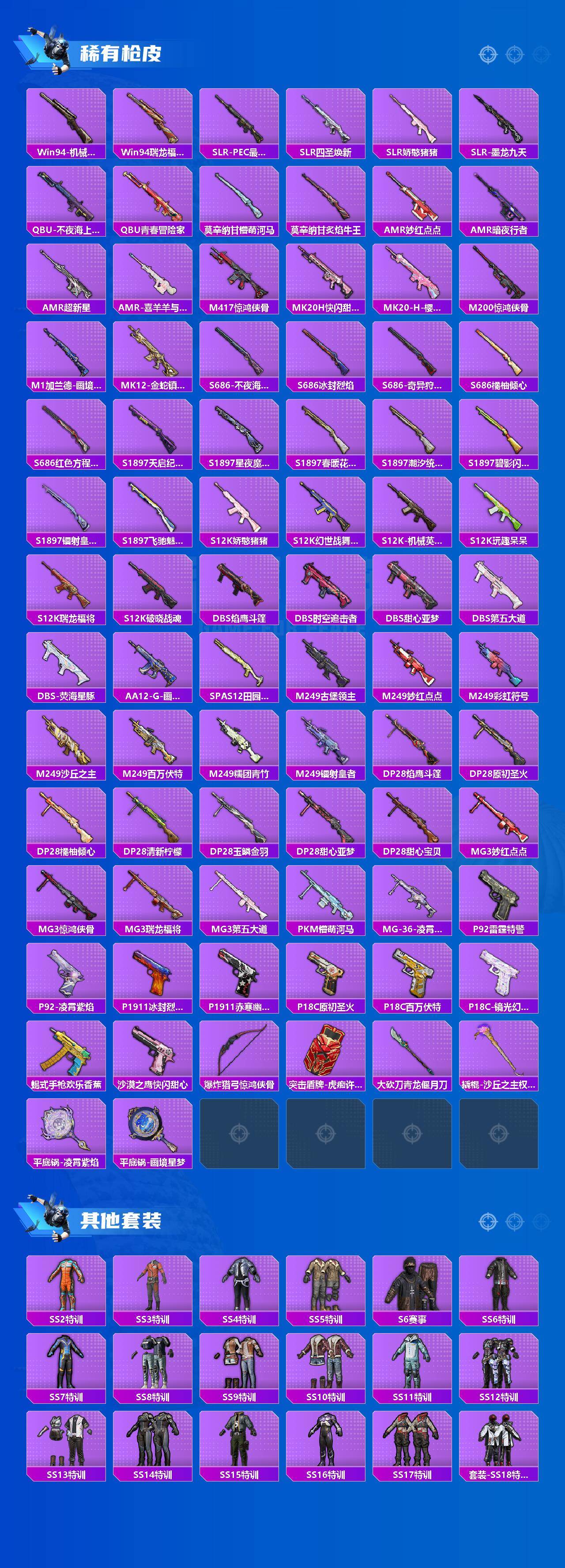 AKM-奇异狩猎者,AKM-百万伏特,AKM-缤纷海域,GROZA-林间仙鹿,AUG-PEC最牛战神,M762-奇异狩猎者,M762-瑞龙福将,Mk47-林间仙鹿,汤姆逊-林间仙鹿,Kar98K-古堡领主,Kar98K-深海曼妙,M24-香水柠檬,M24-奇异狩猎者,AWM-激战未来,S686-奇异狩猎者,M249-古堡领主