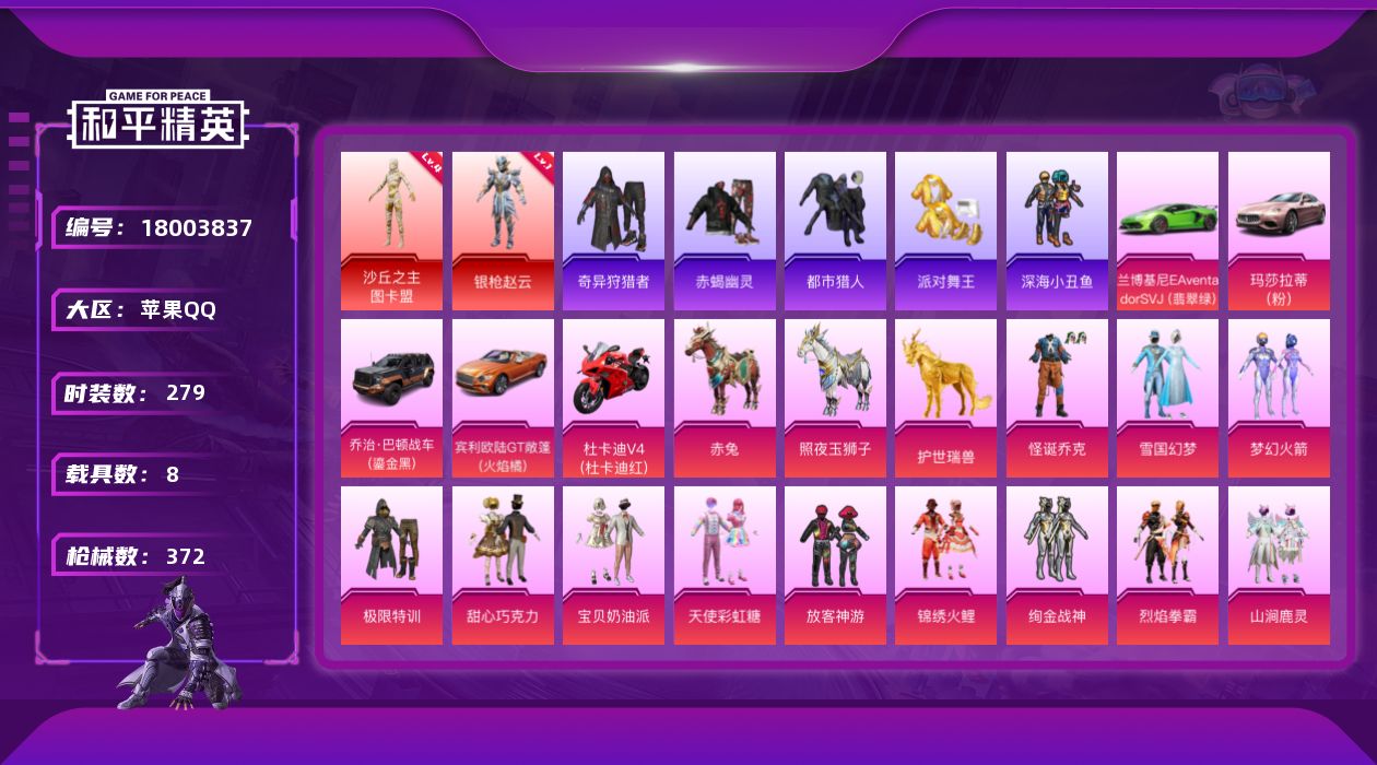 [18003837]沙丘之主-图卡盟(四级)/AKM-盖世英雄(九级)/M416-至情至圣(九级)/无敌战神框1/绝世印记6 【特价出售/店主推荐】 苹果 手Q-无敌战神框-2神装-19粉装-15特效枪-8载具-7粉色飞行器-135875热力值-29王牌印记-279套装-372枪皮【红色神装等级】:沙丘之主-图卡盟(四级),角色-银枪赵云(一级)【热门品类】:粉装-怪诞乔克,粉装-雪国幻梦,粉装-梦幻火箭,套装-赤蝎幽灵,套装-都市猎人,套装-派对舞王,套装-深海小丑鱼,套装-小丑鱼,套装-奇异狩猎者,套装-金羽特工,套装-星河浪客,角色-2B战斗服款,套装-SS1特训,角色-忠真马岱,角色-忠义严颜,套装-暗夜之虎,套装-龟仙人,套装-暗影哥特,套装-粉红小猪,大砍刀-青龙偃月刀,撬棍-龙胆亮银枪,熔岩游骑兵连帽夹克,套装-红熊茄茄【粉色套装】:粉装-极限特训,粉装-怪诞乔克,粉装-甜心巧克力,粉装-宝贝奶油派,粉装-天使彩虹糖,粉装-雪国幻梦,粉装-梦幻火箭,粉装-放客神游,粉装-锦绣火鲤,粉装-绚金战神,粉装-烈焰拳霸,粉装-山涧鹿灵,角色-2号机款机体服,粉装-冰川红玫,粉装-纯珍童话,角色-小叽联名款,角色-光极星,角色-智耀战神【粉色枪皮等级】:AKM-盖世英雄(九级),M416-心之恋语(一级),M416-至情至圣(九级),AUG-超新星(五级),M762-激战未来(五级),蜜獾-异瞳寒姬(一级),P90-能量风暴(一级),P90-沙丘之主(三级),Kar98K-巳巳如意(一级),AWM-湮灭星辰(五级),Mk14-福马献瑞(一级),DP-28-豹影疾电(三级),MG3-梦幻舞会(四级),信号枪-金乌曜日(六级)【粉色载具】:兰博基尼Aventador SVJ(翡翠绿),玛莎拉蒂Ghibli(粉),乔治巴顿战车(鎏金黑),宾利欧陆GT敞篷(火焰橘),杜卡迪 Panigale V4(杜卡迪红),赤兔,照夜玉狮子,护世瑞兽【粉色枪皮】:AKM-盖世英雄,M416-心之恋语,M416-至情至圣,AUG-超新星,M762-激战未来,蜜獾-异瞳寒姬,P90-能量风暴,P90-沙丘之主,Kar98K-巳巳如意,AWM-湮灭星辰,Mk14-福马献瑞,DP-28-豹影疾电,MG3-梦幻舞会,信号枪-金乌曜日,破片手榴弹-粉粉猫爪 【粉色飞行器】:梦幻火箭飞行器,暗翼战神飞行器,风花雪月