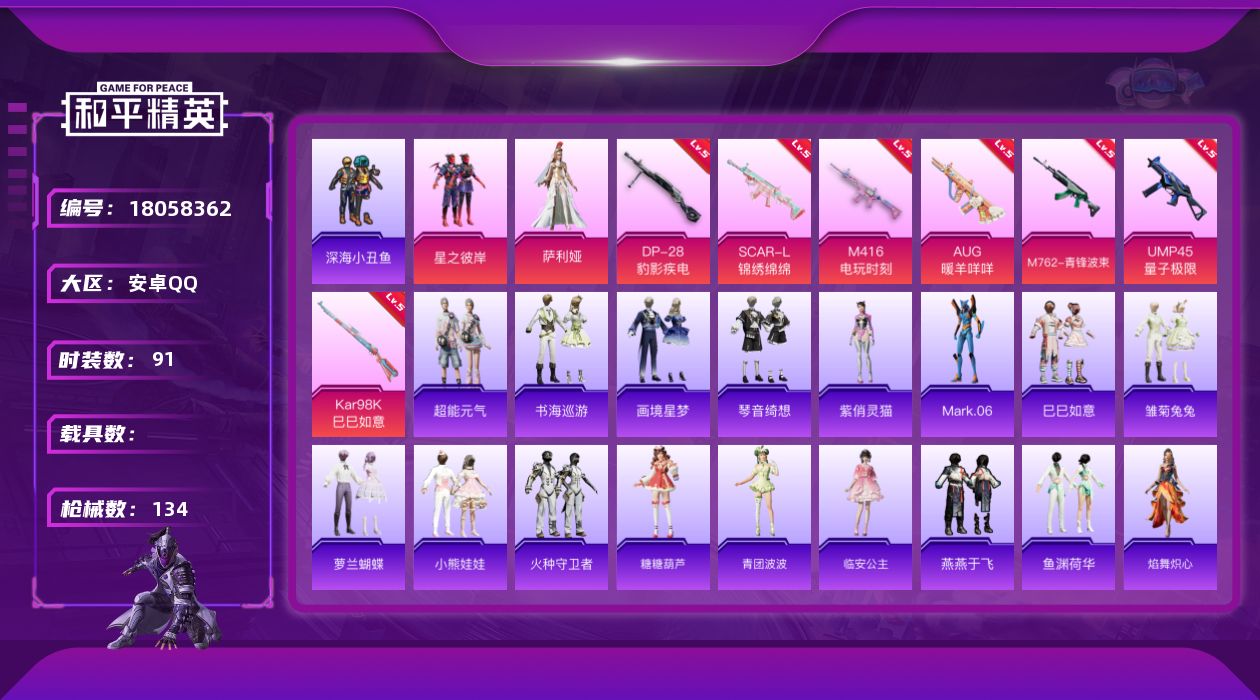 - [17734674]【店主推荐捡漏号!可直接换绑】安卓 手Q-1神装-1粉装-5特效枪-1载具-9粉色飞行器-38267热力值-3王牌印记-81套装-131枪皮 【红色神装等级】:最终圣卫者-帕修斯(一级) 【红色角色神装】:最终圣卫者-帕修斯 【热门品类】:套装-龟仙人,套装-粉红小猪,角色-8号机 【粉色套装】:粉装-星之彼岸 【粉色枪皮等级】:SCAR-L-锦绣绵绵(五级),GROZA-精灵之光(三级),UMP45-萌骑冒险(二级),AKS-74U-森灵之息(五级),Mk14-福马献瑞(五级) 【粉色载具】:黑曜夜骑 【粉色枪皮】:SCAR-L-锦绣绵绵,GROZA-精灵之光,UMP45-萌骑冒险,AKS-74U-森灵之息,Mk14-福马献瑞 【粉色飞行器】:香车宝马飞行器,炫彩糖果飞行器,沙丘之主天马,幻海精灵飞行器,曦光华影飞行器,圣域金龙飞行器,终晖之翼飞行器,云梦轻舟飞行器 【粉色降落伞】:梦幻火箭降落伞,仲夏莫吉托降落伞,猪猪侠降落伞,初号机 觉醒Ver.降落伞,精灵之光降落伞,无垠阁降落伞,异瞳寒姬降落伞,炫彩糖果降落伞 【稀有套装】:套装-龟仙人,套装-雪国风尚,套装-炫彩糖果,套装-马上来财,套装-萝兰蝴蝶,角色-摩登魅猫,角色-绯色魅影,角色-紫俏灵猫,套装-书海巡游,套装-画境星梦,套装-琴音绮想,角色-馥郁金蕊,套装-雨过天青,套装-红釉青花,角色-曹焱兵 【稀有枪皮】:AUG-冰晶雪宝,AKM-彩虹符号,AKM-破晓战魂,AKM-龙的传人,AKM-灵猫魔法师,M16A4-千金淑猫,SCAR-L-夜灯,SCAR-L-炫彩节奏,M416-糯团青竹,M416-红色方程式,M416-蓝色火焰,GROZA-彩虹符号,AUG-天降萌叽,AUG-青春冒险家,M762-天降萌叽,G36C-灵驹仙姬,AC-VAL-快闪甜心,蜜獾-天降萌叽,Famas-霜月狼主,ACE32-画境星梦,UZI-啾咪啾咪,UZI-影袭,UZI-炫彩节奏,UMP45-夜灯,UMP45-猪猪侠,UMP45-生命誓言,UMP45-极意拳锋,Vector-焰鹰斗篷,Vector-彩虹符号,Vector-生命誓言,汤姆逊-天降萌叽,汤姆逊-像素花束,MP5K-画境星梦,P90-快闪甜心,P90-霜月狼主,Kar98K-彩虹符号,M24-炫彩节奏,AWM-焰鹰斗篷,AWM-恐龙拽拽,Mini14-炫彩节奏