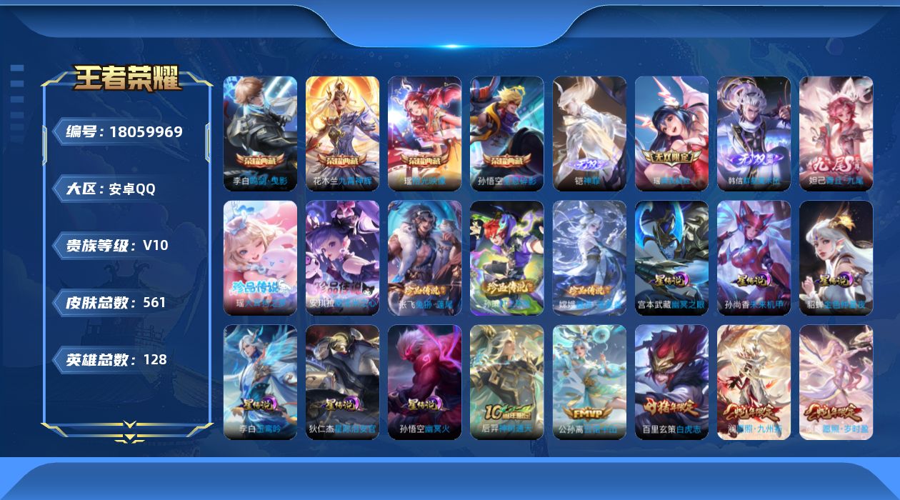 [18059969]8天幕!连体号!!王者安卓q连体安卓和平q/安卓Q-V10-至尊星耀IV段位-128英雄-561皮肤-4典藏皮肤-4无双-5珍品传说-6星元-83传说-182史诗-和平-1红-8粉装-10特效枪-4载具-1僚机