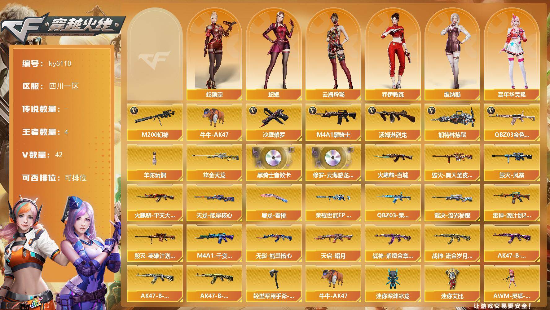 [17990314]【ky5110】四川一区-42V-4王者-1炫金 【热门武器】:QBZ03-金色蔷薇,M200-幻神,牛牛-AK47,M4A1-黑骑士,汤姆逊-烈龙*4,加特林-炼狱,羊驼玩偶,沙鹰-修罗 【王者炫金武器】:炫金天龙 【音效卡】:修罗-云海游龙音效卡,M4A1-黑骑士音效卡 【皮肤】:幻神-荣耀世冠EP 皮肤,QBZ03-荣耀世冠EP 皮肤,裁决-流光秘银,雷神-源计划2.0专属 皮肤,火麒麟-平天大圣,火麒麟-百城,毁灭-黑大圣皮肤,毁灭-风暴*2,毁灭-英雄计划 皮肤,M4A1-千变-孔明皮肤,无影-能量核心,天启-暗月,战神-紫绶金章皮肤,战神-流金岁月皮肤,AK47-B-常胜将军-曹操,AK47-B-常胜将军-刘备,AK47-B-常胜将军-孙权*2,天龙-能量核心,屠龙-春桃 皮肤,轻型军用手斧-再燃火线 【角色】:妮妮,王者春,蛇隐宗,乔伊教练,修道士,云海玲珑,暗夜-X,风暴女*2,嘉年华灵狐,灵狐者-黄金海岸,灵狐者-七夕宝贝,灵狐者-职业经理,曼陀罗-X,潘多拉-X,潘多拉-甜心教官,蛇姬,兔囡囡,维纳斯 【人偶武器】:AWM-灵狐-15周年嘉年华,牛牛-AK47,迷你深渊冰龙,迷你裂空之翼*2,迷你牛牛,迷你生化手雷,生化手雷-机甲核心,深渊终结者手雷,闪光弹-貂蝉,高爆手雷-大乔,迷你艾比 【暴走生化】:黑龙吞噬者,超级对讲机 【挑战大师】:火狱乱世-超越Max,激光毁灭者III-白马银枪 【英雄级武器】:M4A1-千变,AK47-火麒麟,M4A1-雷神,M4A1-黑骑士,AK12-天启*2,无影-神兵利器,QBZ03-金色蔷薇,王者之武-觉醒版,黑骑士-海王*2,AK47-B-常胜将军,Barrett-毁灭*2,AWM-裁决,M200-幻神,加特林-炼狱,炼狱-风暴,汤姆逊-烈龙*4,AA-12-雷霆,沙鹰-修罗,沙鹰-天神*2,柯尔特-荣耀世冠EP,王者之灵-觉醒版,屠龙*2,麒麟刺-堕天神,麒麟刺-百战金芒,王者之啸-觉醒版,王者之击-觉醒版,高爆手雷-堕天神,手雷-云海游龙,闪光弹-堕天神,烟雾弹-堕天神,烟雾弹-幻灵,烟雾弹-古蛇迷踪,烟雾弹-荣耀世冠EP,M4A1-赤狱骑士 【道具】:亚洲杯纪念炫彩背包,冰冰企鹅背包-猛男专用,冰冰企鹅背包,百战金芒炫彩背包,虎牙炫彩背包,超级背包*2,女皇终结者-魔龙之吻,绿色巨人,灵魂忍者*2,
