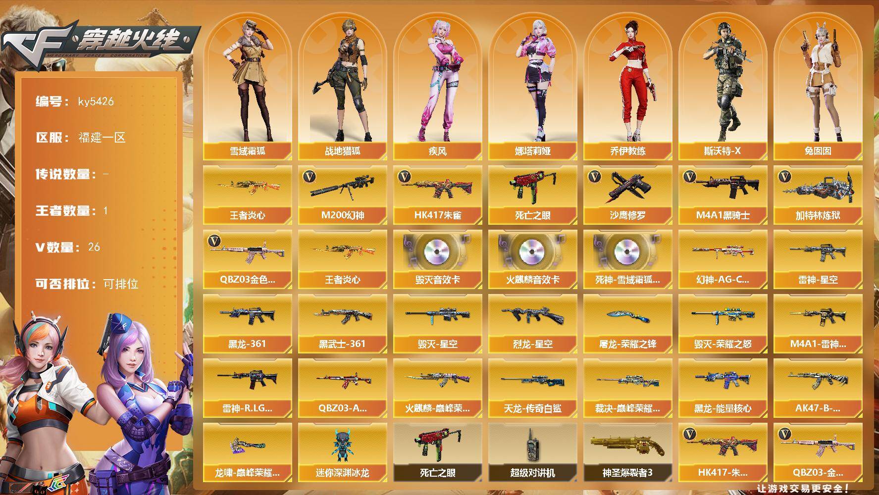 [18059946]【ky5426】福建一区-26V-1王者武器数-0炫金武器数 【热门武器】:QBZ03-金色蔷薇,HK417-朱雀,M200-幻神,死亡之眼*2,王者炎心,M4A1-黑骑士,加特林-炼狱,沙鹰-修罗 【王者炫金武器】:王者炎心 【音效卡】:AK47-火麒麟音效卡,Barrett-毁灭音效卡,死神-雪域霜狐-怀旧音效卡 【皮肤】:幻神-AG-CFPL S24冠军 皮肤,QBZ03-AG-CFPLS19冠军,裁决-巅峰荣耀 皮肤,烈龙-星空,雷神-星空,M4A1-雷神-CFS 2019,雷神-R.LGD-CFPLS18冠军,火麒麟-巅峰荣耀,毁灭-荣耀之怒*2,毁灭-星空,黑龙-能量核心,M4A1-黑龙-361,AK47-黑武士-361,AK47-B-常胜将军-刘备,AWM-天龙-传奇白鲨*2,屠龙-荣耀之锋,龙啸-巅峰荣耀 皮肤*2 【角色】:魅影,战地猎狐,雪域霜狐,乔伊教练,疾风,娟娟,兰-海滩派对,麻雀,娜塔莉娅,斯沃特-X,蜀雪,兔囡囡,雅典娜,海豹突击队 【人偶武器】:迷你深渊冰龙 【暴走生化】:死亡之眼*2,超级对讲机 【挑战大师】:神圣爆裂者III 【英雄级武器】:AK47-火麒麟,M4A1-黑龙,M4A1-雷神,M4A1-黑骑士,AK47-黑武士,HK417-朱雀,死神-雪域霜狐,QBZ03-金色蔷薇,AK-47-猩红传说,AWM-天龙,Barrett-毁灭,AWM-裁决,M200-幻神,加特林-炼狱,AA-12-雷霆,沙鹰-修罗,屠龙,擎天,高爆手雷-雷霆,闪光弹-雷霆,烟雾弹-雷霆,M4A1-赤狱骑士 【道具】:云山科技背包,亚洲杯纪念炫彩背包,炫彩背包-诺拉,炫彩背包,背包-洛丽塔,超级背包,雪域霜狐炫彩背包,黑桃战神背包,女皇终结者-魔龙之吻,救世主-黑桃战神,黄金生化钩,绿色巨人,灵魂忍者,迷雾幽灵,夺命之镰,防化服*2,流光-再燃火线,语音特效-怀旧,雪域霜狐表情,C4-再燃火线,防弹头盔*3,防弹衣*3,C4工具钳*4,手雷包*4 【特殊枪械】:1黑骑士,1炼狱