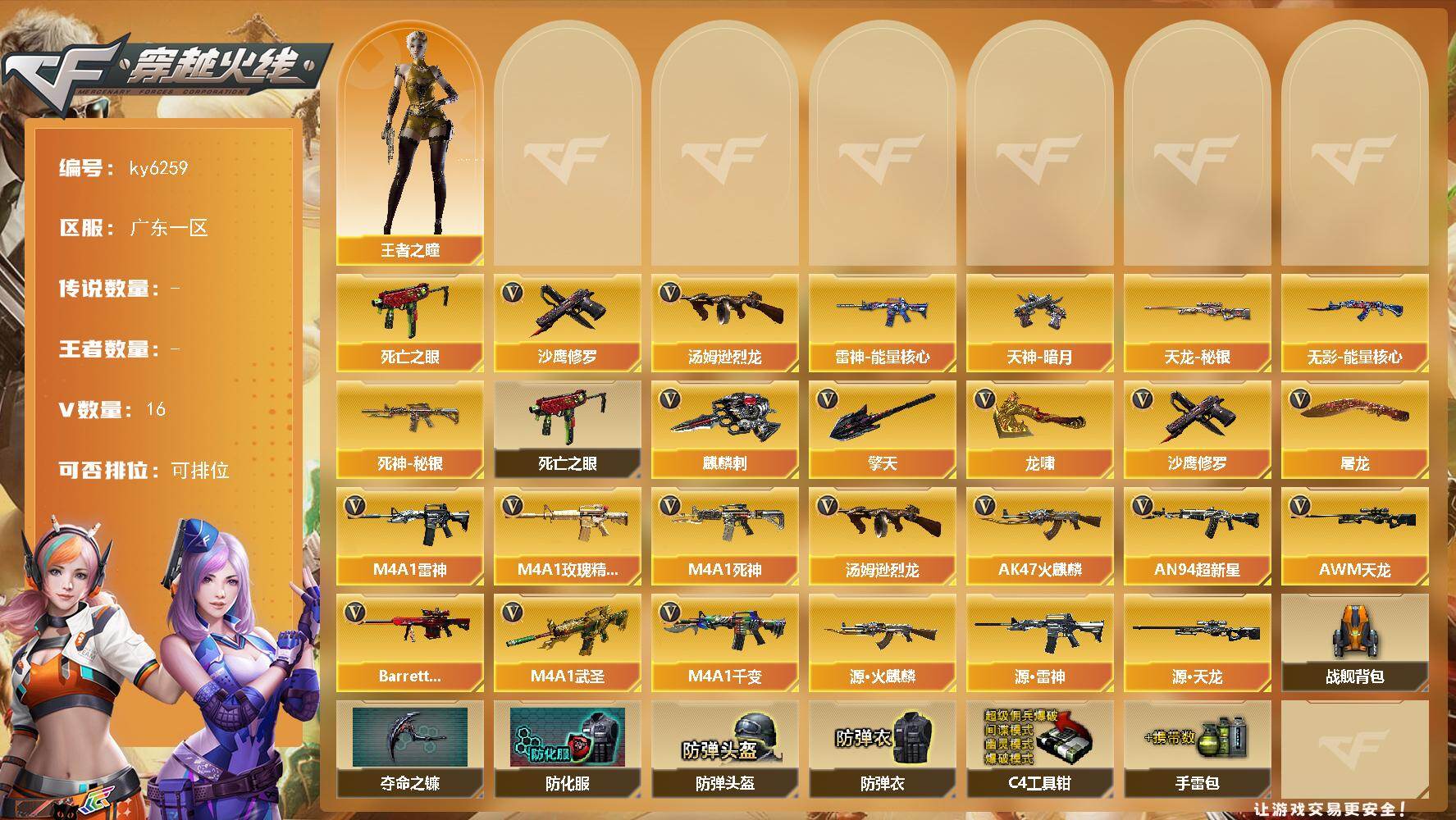 [18062668]实名: 可修改 排位资格: 有 V武器: AK47-火麒麟,M4A1-雷神,M4A1-死神,M4A1-武圣,M4A1-千变,M4A1-玫瑰精灵,Barrett-极光,AWM-天龙,AN94-超新星,汤姆逊-烈龙,沙鹰-修罗,屠龙,龙啸,麒麟刺,擎天 狙击枪稀有皮肤: 天龙-秘银 英雄角色: 王者之瞳 亮点: 【ky6259】广东一区-16V-0王者武器数-0炫金武器数【热门武器】:死亡之眼,汤姆逊-烈龙,沙鹰-修罗【皮肤】:雷神-能量核心,无影-能量核心,死神-秘银,天龙-秘银,天神-暗月*2【角色】:王者之瞳【暴走生化】:死亡之眼【英雄级武器】:M4A1-千变,AK47-火麒麟*2,M4A1-雷神,M4A1-死神,AN94-超新星,M4A1-武圣,M4A1-玫瑰精灵,AWM-天龙,Barrett-极光,汤姆逊-烈龙,沙鹰-修罗,屠龙,龙啸,擎天,麒麟刺【源级武器】:源·火麒麟,源·雷神,源·天龙【道具】:战舰背包,夺命之镰,防化服,防弹头盔,防弹衣,C4工具钳,手雷包【特殊枪械】:1烈龙